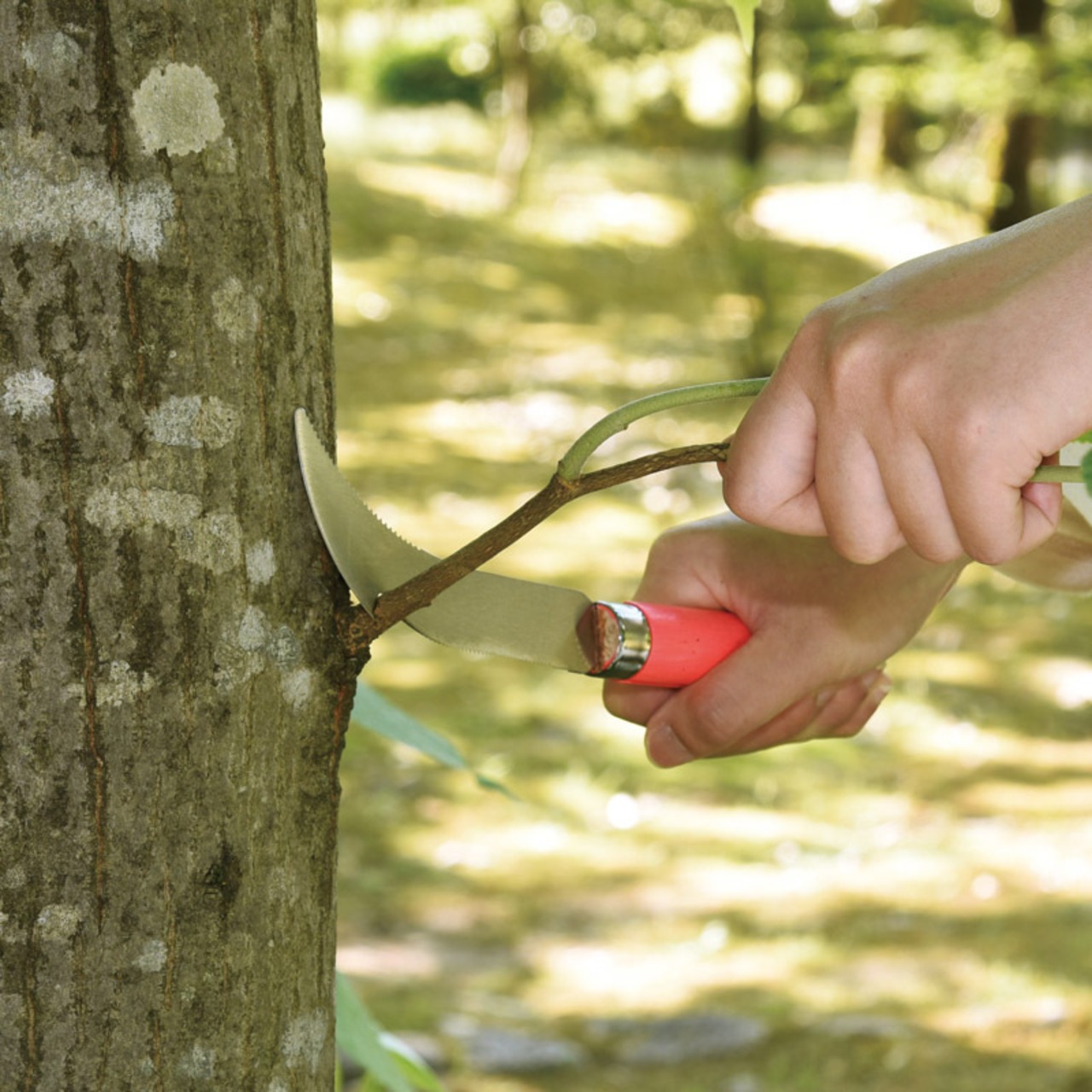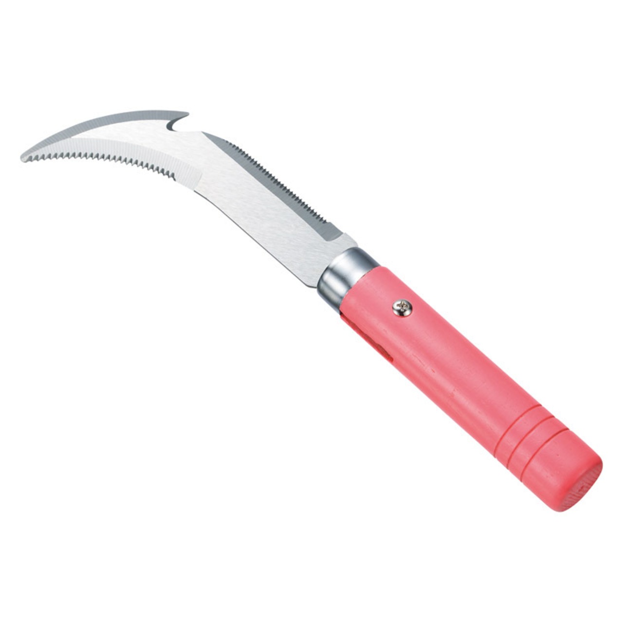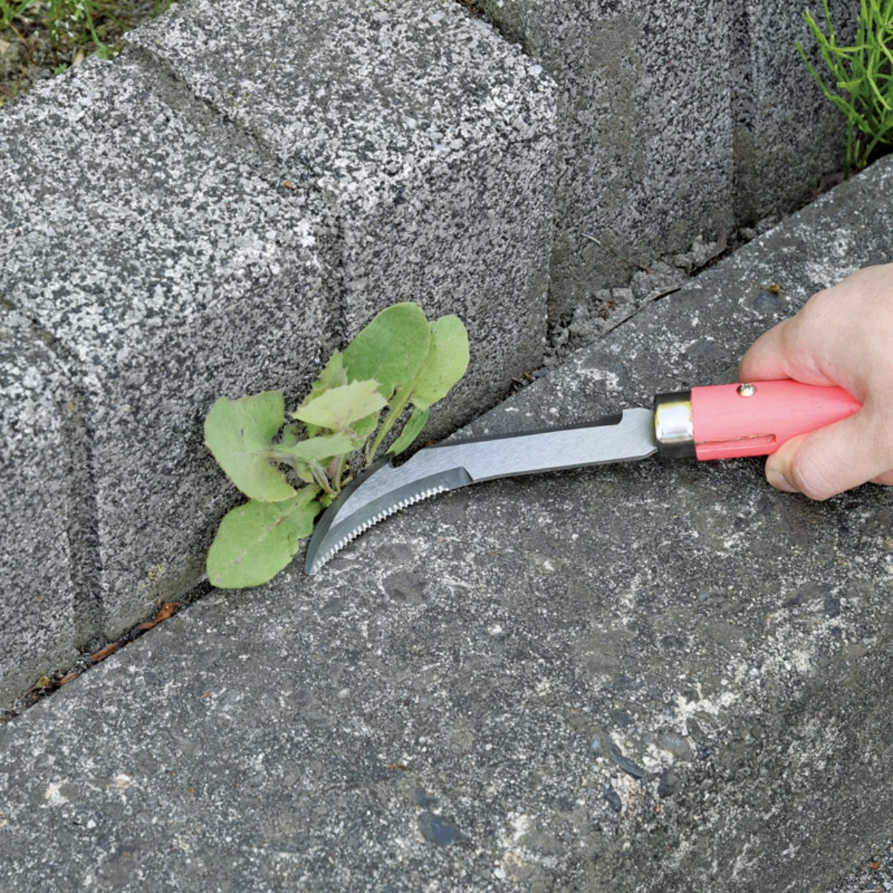 4つの機能が付いている、新しい鎌になります。鋭い鋸刃の鎌で様々な草を刈ります。外側の鋸刃で小枝などが切れるのこぎりになります。カッティングフックが付いているので、ツタなどが切れます。上部に刃が付いていますので、壁際などを切ることができます。