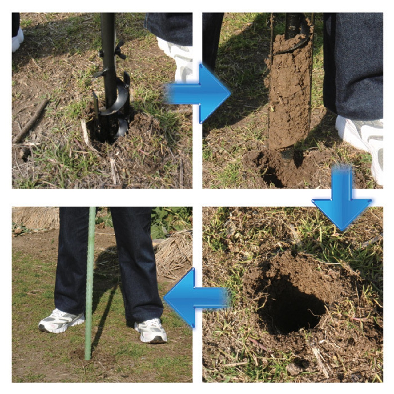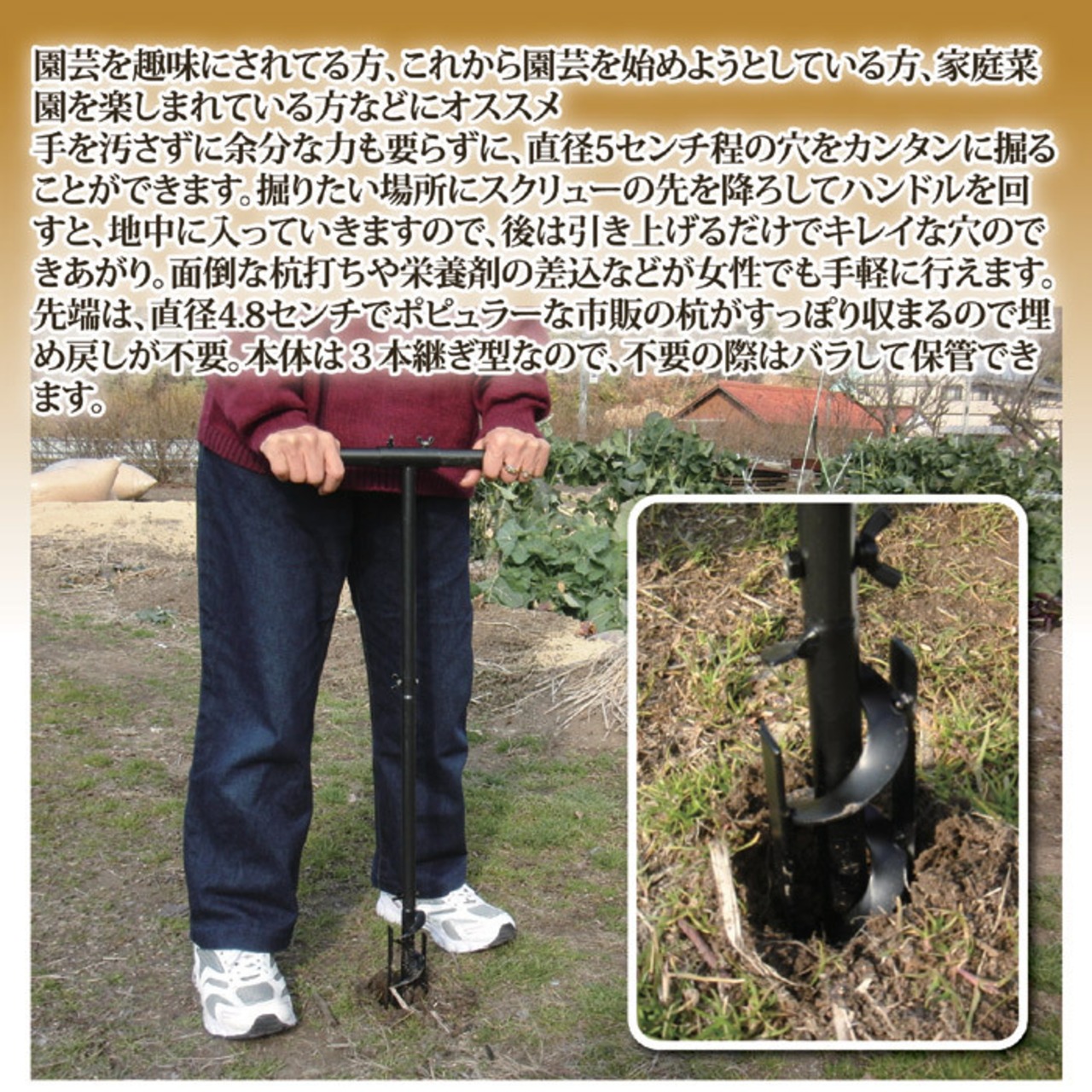 園芸を趣味にされてる方、これから園芸を始めようとしている方、家庭菜園を楽しまれている方などにオススメ。手を汚さずに余分な力も要らずに、直径5センチ程の穴をカンタンに掘ることができます。掘りたい場所にスクリューの先を降ろしてハンドルを回すと、地中に入っていきますので、後は引き上げるだけでキレイな穴のできあがり。面倒な杭打ちや栄養剤の差込などが女性でも手軽に行えます。先端は、直径4.8センチでポピュラーな市販の杭がすっぽり収まるので埋め戻しが不要。本体は3本継ぎ型なので、不要の際はバラして保管できます。