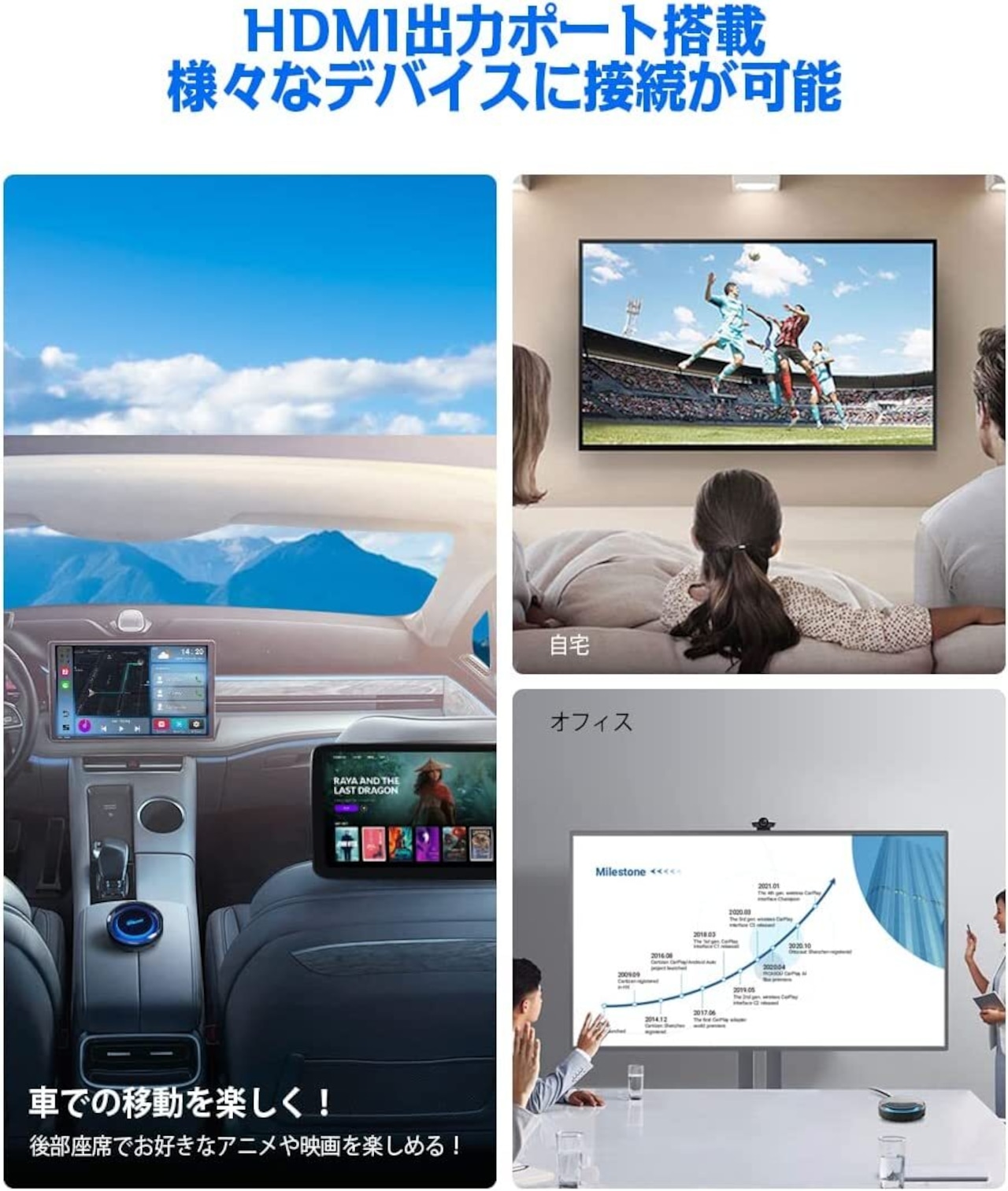 前作より、今回は新しくHDMIポートが搭載され、リア席のモニタリングも実現しました。本製品とリア席モニターをHDMIケーブルで接続することで、カーナビで道案内、リア席モニターで動画視聴が可能になりました。車内だけでなく、事前にゲームアプリをAI Boxにダウンロードして、HDMI端子により自宅テレビへ出力して、大きな画面でゲームを楽しめます。 ※パッケージにはHDMIケーブルが含まれておりません。ご自身でご購入・ご準備する必要がございますので、予めご了承ください。