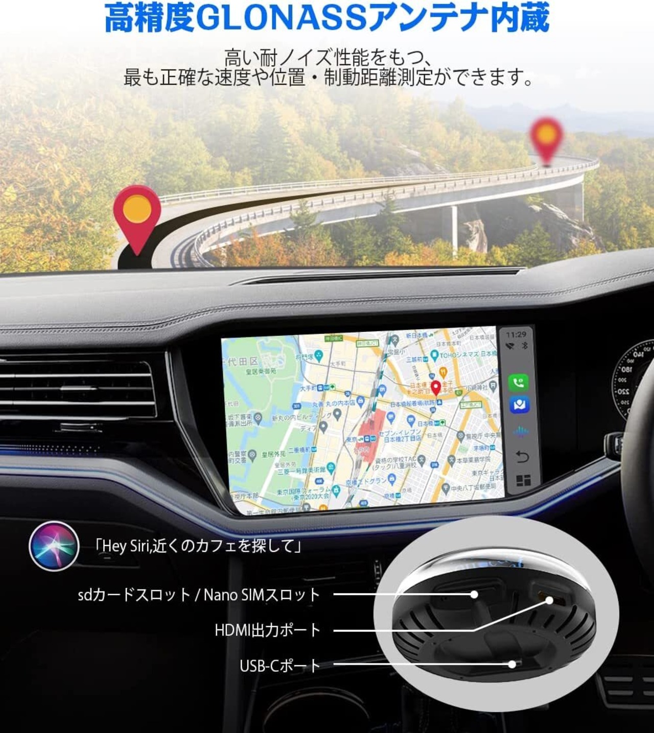 SIMカードスロットも搭載していて、3G/4Gの通信規格に対応しています。車両のCarPlay対応usb口に接続して、スマホのテザリング又はnanoSIMカードを挿入すればすぐにナビ画面が、タブレットに早変わりです。別の車に持っていってもそこでも使えます。