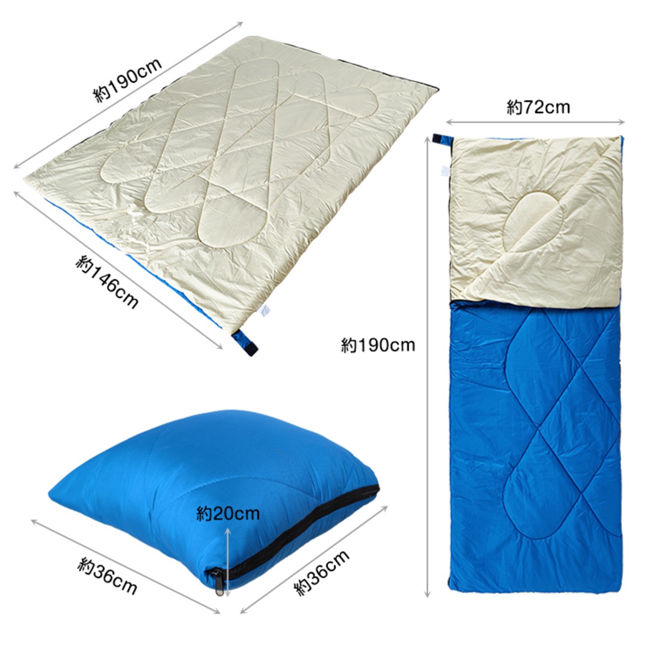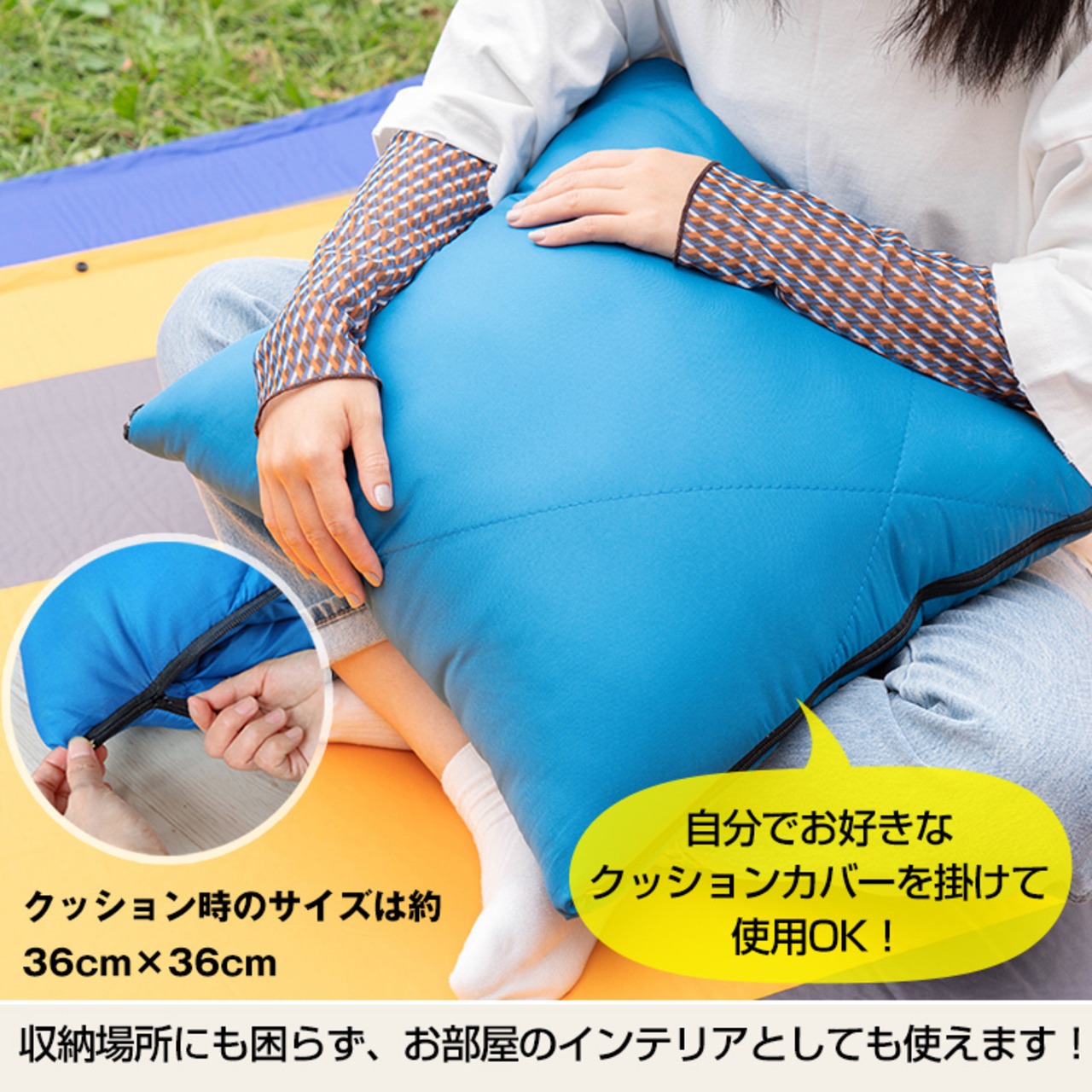 ■収納時はクッションや枕として、開けると寝袋に、チャックを広げると敷ふとんや敷きマットとして使用可能!