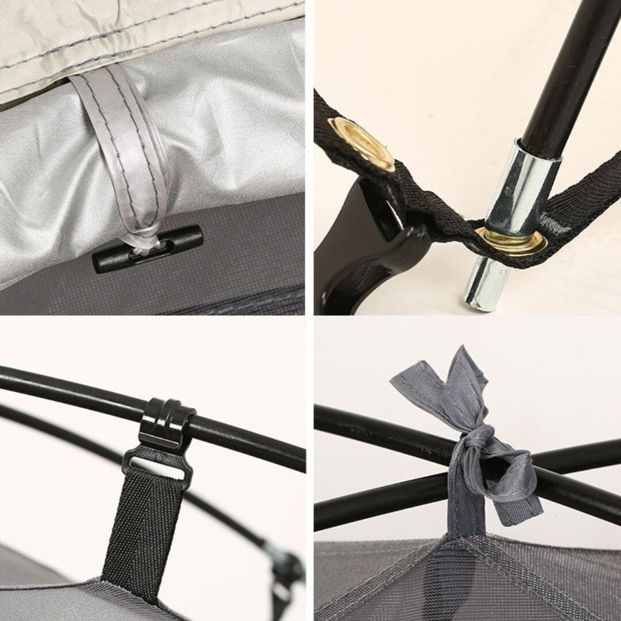 吊り下げ式のテントで組み立てはとても簡単。収納時はコンパクトになるので、移動する時に便利。キャノピー使用もできます
