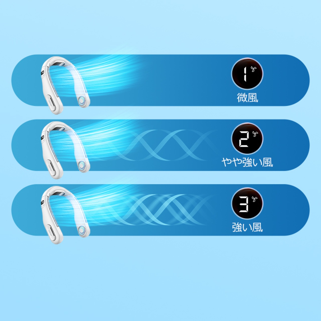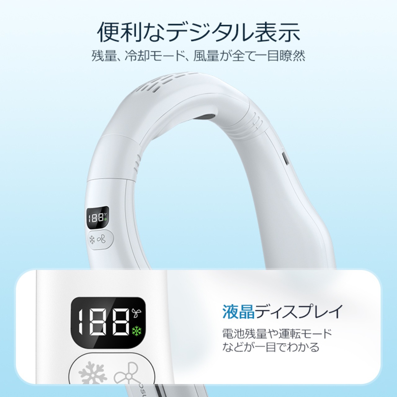 【商品名】首掛け扇風機 【電池容量】5200mAh 【定格消費電量】3.5W(Max) 【入力電圧電流】5V/2A 【重量】約425g 【サイズ】約220*203*55mm 【製造国】中国 【3段階風量調節&2段階冷却】 風量は弱風・中風・強風の3段階から選択可能で、風量調節ボタンを繰り返し押すだけで、適切な速度に切り替わります。冷却は中・強の2段階から選択可能で、冷感モードのオン/オフでも雪印ボタンで切り替れます。 【大容量バッテリー&デジタルディスプレイ】 5200mAhのリチウムイオン電池が内蔵されており、最大12時間の連続使用が可能です(風量段階によって異なる)。本品の定格電圧電流は5V/2Aで、5V/2Aの充電器から充電してください、フル充電は約3~5時間です。デジタルディスプレイ付きで、風量レベルや冷却モードまたは電池残量は一目瞭然ですぐ確認できます。外出先で扇風機の電源が切れて使えなくなるのを心配ありません。 【羽根なし&360°サラウンド型送風&静音設計】 従来の羽根のついた扇風機とは異なり、羽根なし首掛けモデルで、送風口が最新の特許設計を採用、空気を取り込む吸気口は長い髪でも巻き込みにくいブレードレス設計になっているため、万が一髪の毛が近くにあっても吸い込まれにくく安心してお使いいただけます。安全で信頼性が高い!360°均一送風、ドライアイや頭痛を防ぐことができます。2023年にバージョンアップし、ABS素材と高品質ブラシレスモーターの採用により、ノイズを最小化。運転中の騒音は15dBとなりました。低騒音化により、快適で静かな環境で生活を楽しむことができます。図書館でも閲覧室でも大活躍。