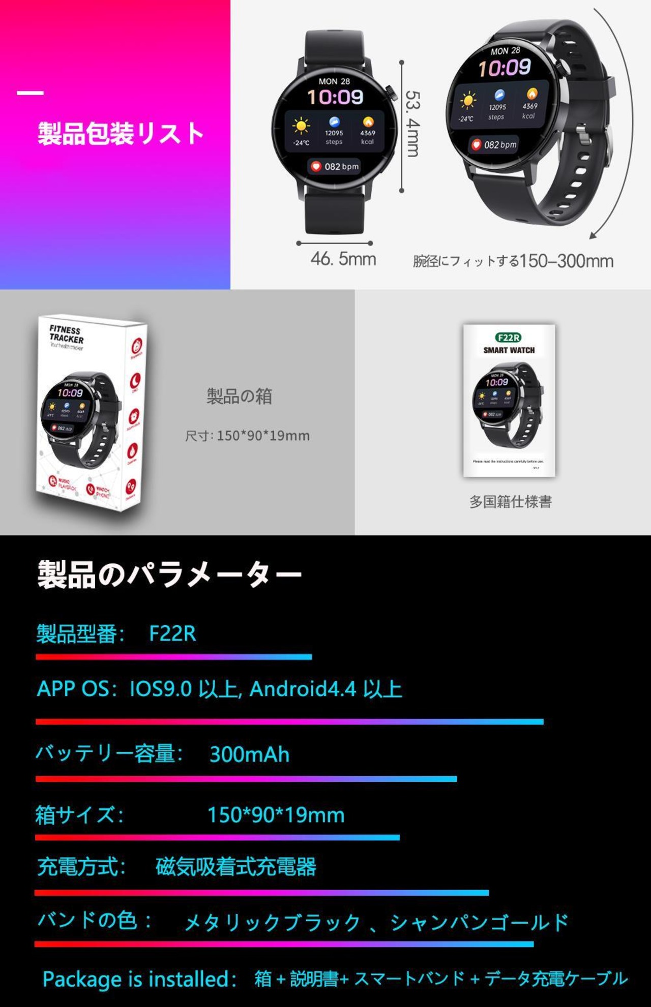 スマートウォッチ 通話機能 Bluetooth通話 F22R 皮膚温変動測定 血糖値測定 血中酸素濃度 心拍計 腕時計