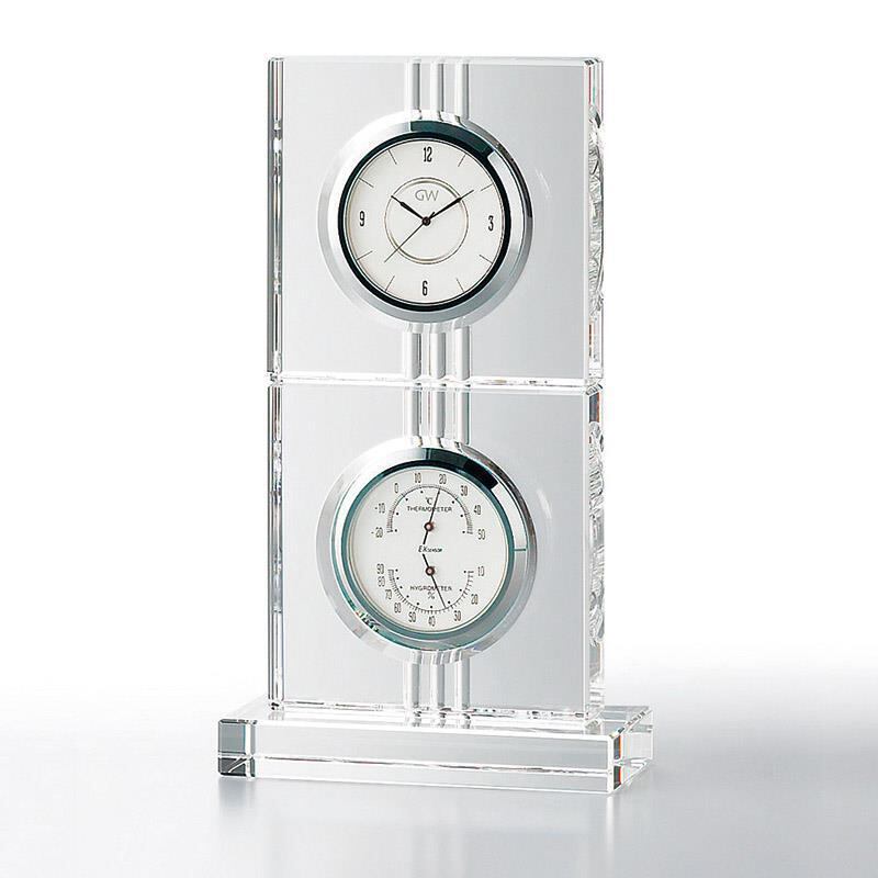 透明感あふれるエグゼクティブな輝き、気品に満ちたスタイリッシュなフォルムはギフトに最適です。ガラスの中でも透明感が高く、硬度が高いためキズがつきにくい光学ガラスを使用しています。いつまでも変わらぬ輝きが、お部屋に品格をもたらします。温度計、湿度計を備えた機能的なクロックです。