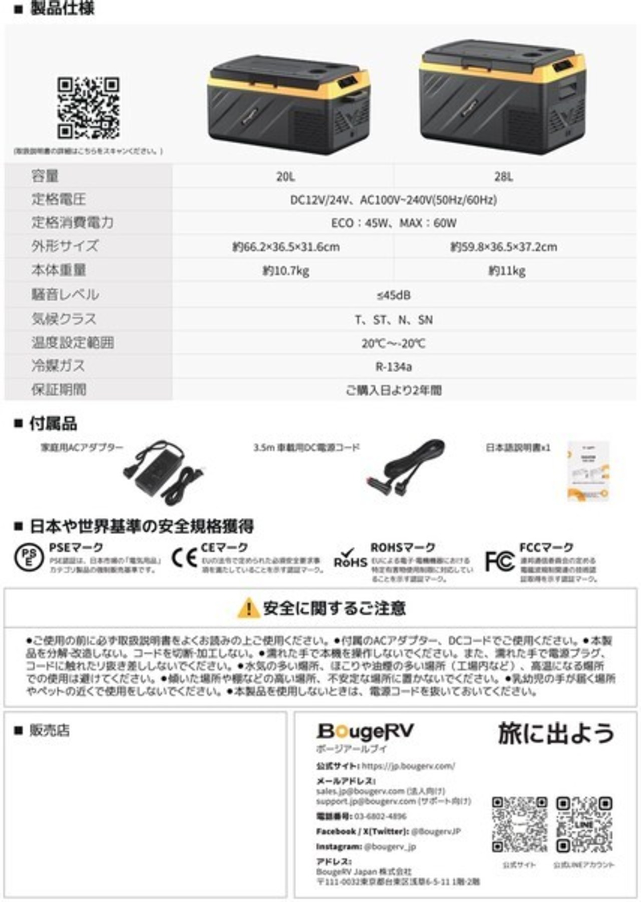家庭用ACアダプター、3.5m車載用DC電源コード、日本語説明書×1、車載冷蔵庫本体×1、ゴム足の予備×2