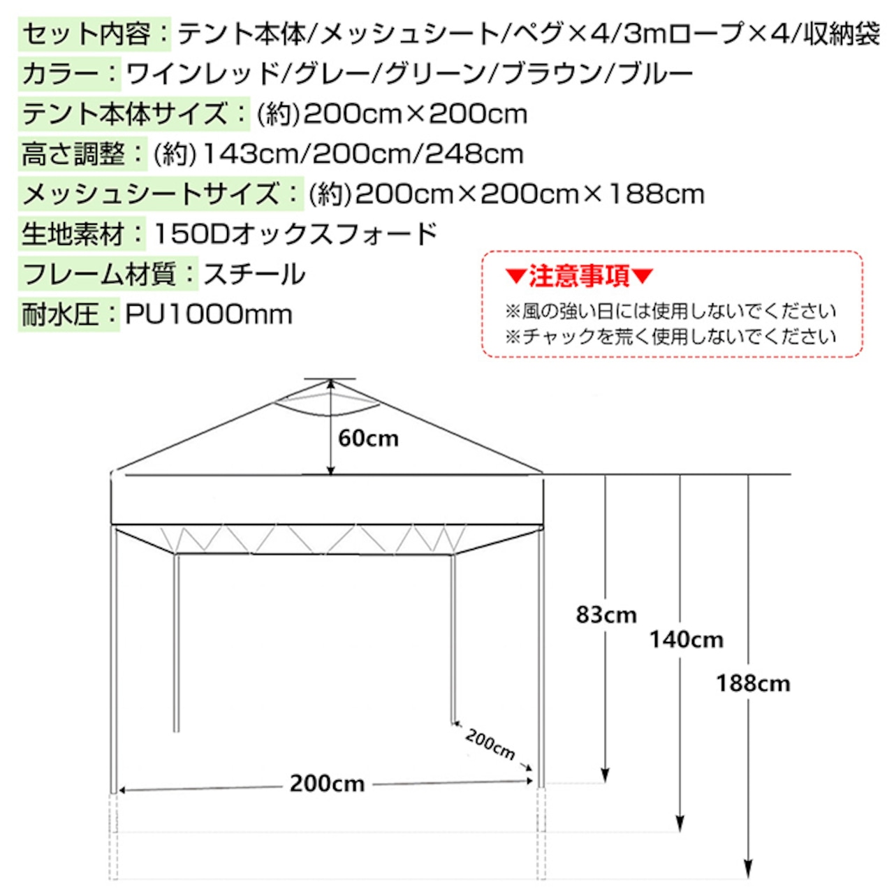 【テント本体サイズ】:(約)200cm×200cm