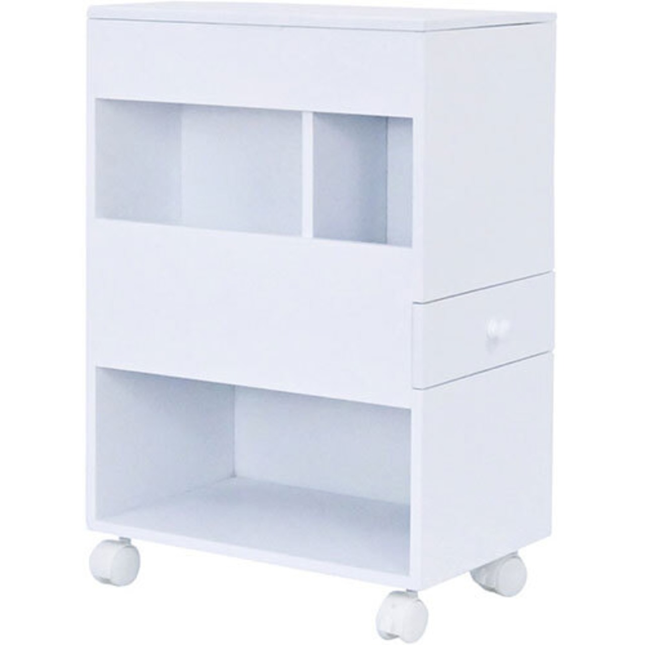 コンパクトなのに大容量収納なコスメワゴン。ミラーと引き出しとオープン収納もあり便利です。オープン収納にはティッシュケース等も収納できます。お手持ちのメイク道具、アクセサリー、美容家電等をスッキリ収納することができます。リビングや寝室などお好きな場所に移動させてメイクを楽しめます。普段は天板をたたんでサイドテーブル代わりにも使えます。