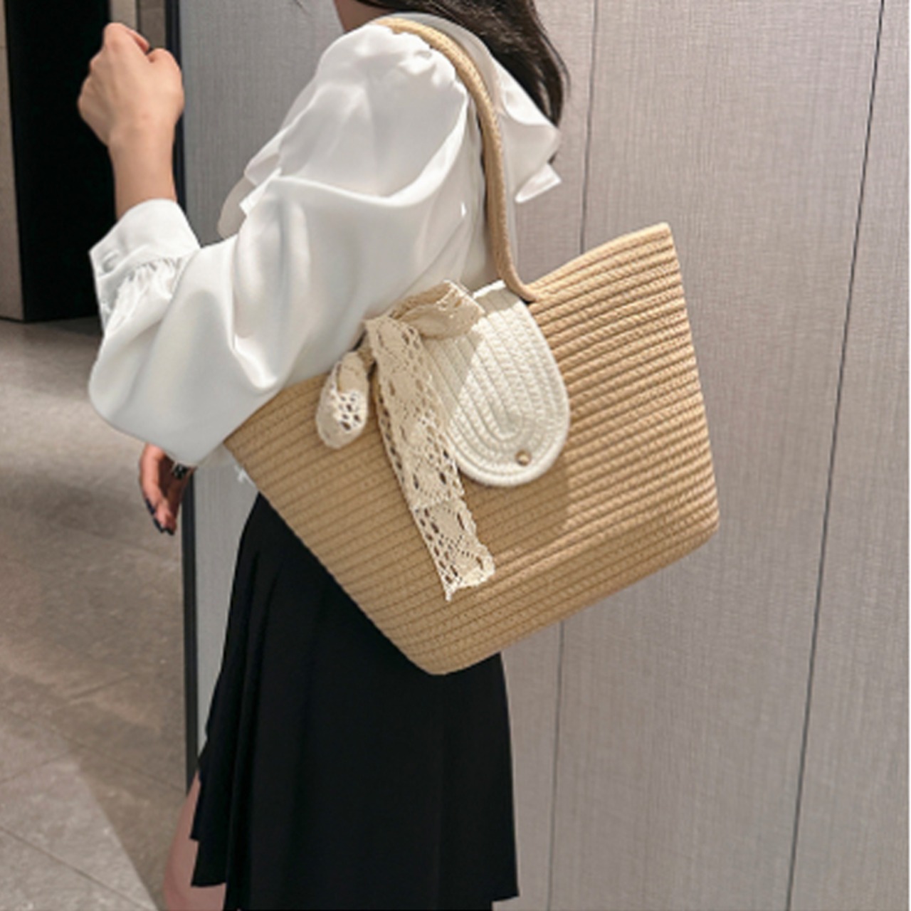 ハンドルスカーフがアクセントのストローバッグ