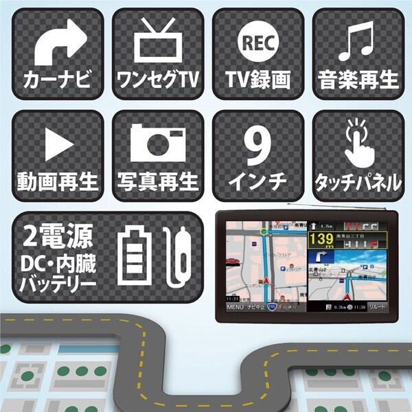 カーナビ/ワンセグTV/TV録画/音楽再生/動画再生/写真再生/9インチ/タッチパネル/2電源 DC・内蔵バッテリー