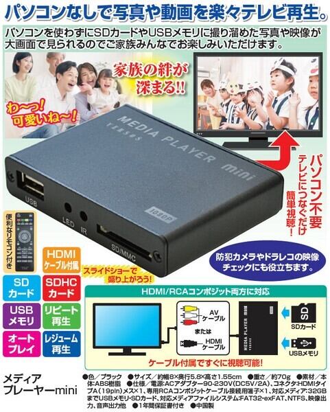 ●HDMIケーブル付属、SDカード、SDHCカード、USBメモリ、リピート再生、オートプレイ、レジューム再生