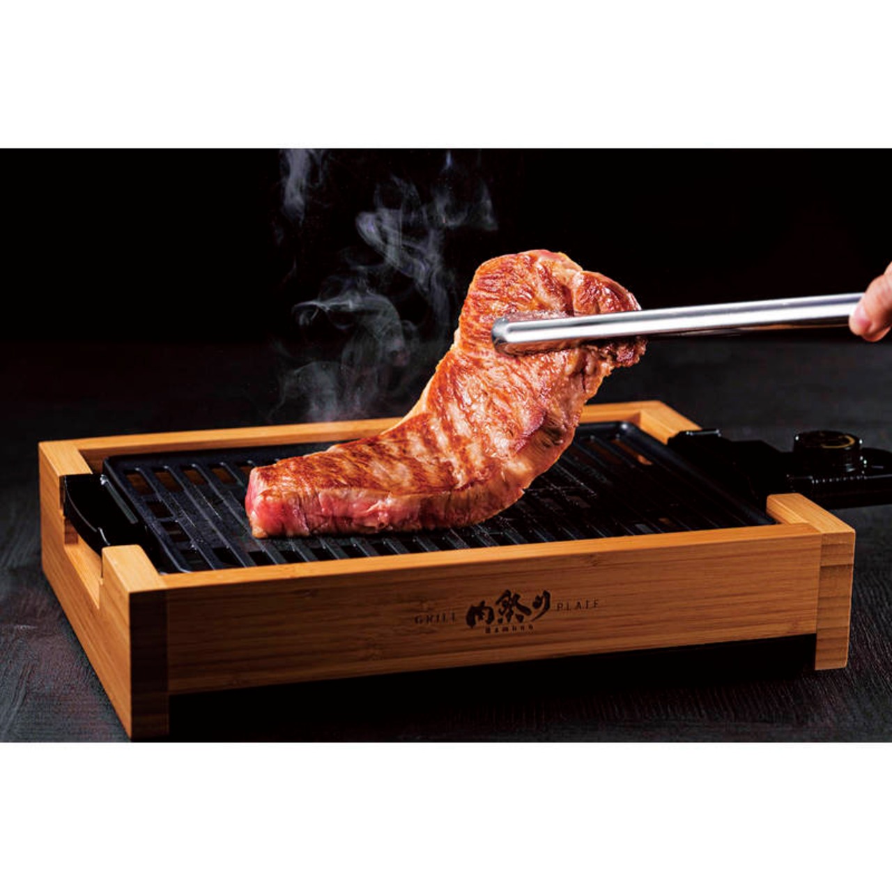まるでお店焼き肉。高級感あるバンブー製フレームで食卓がワンランクアップ。竹材を使用することで高級感のある肉祭りプレート。余分な脂を落とすグリルホールなので減煙・減脂を実現。
