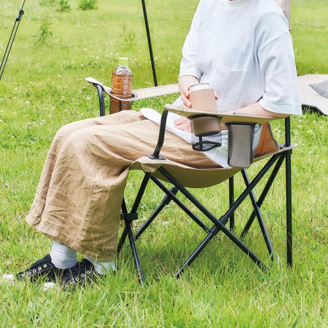 背もたれの角度にこだわった、ゆったり座れる広座面設計のハイタイプキャンプチェア。ひじ掛けにはドリンクホルダー2個とスマホホルダー付き。耐荷重:約120kg