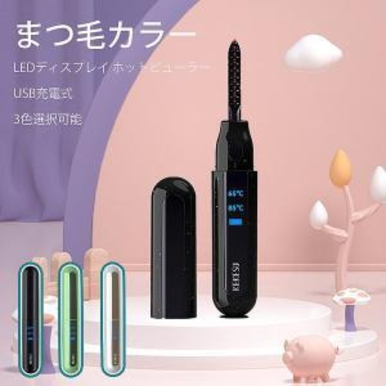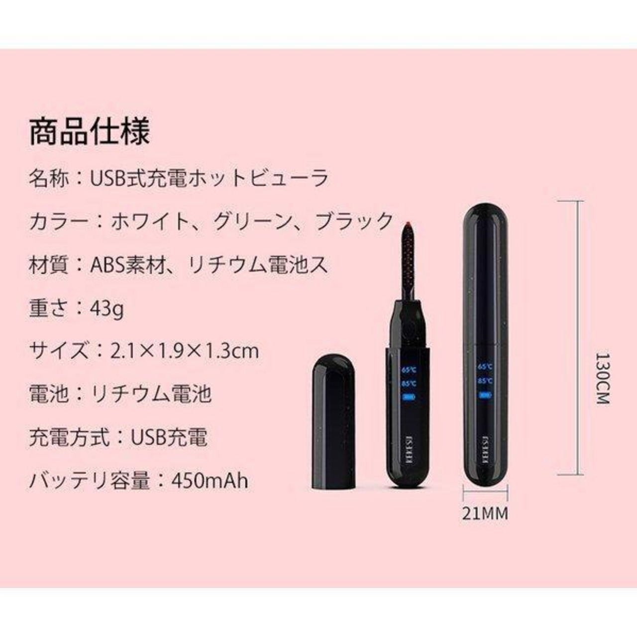 使用方法1.温めたアイロン部にまつげをのせ、まぶたと平行にして3秒間キープ。2.そのままアイロン部をゆっくり毛先まで動かします。3.最後に、まつげを軽く押すようにカールをつくって、3秒間キープ。使用上の注意●マスカラを塗った状態での使用で、目やまぶたなど異常を感じた時は、使用を中止する。●ヒーターが肌に触れ、熱さを感じた時は、水で冷やす。●使用中や使用後に目やまぶたなどの異常を感じた時は、専門医に相談する。●使用後はスイッチをOFFにする。(電池の消耗を防ぐため)●使用後は必ずキャップを取りつけて保管する。