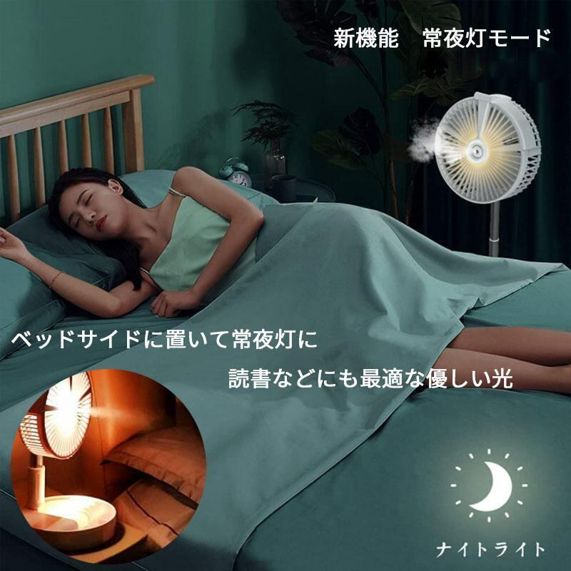 【多機能扇風機】弱・中・強・リズム風の4段階切り替え可能です。台座が90℃回転するので首振りと同様に様々な角度へ送風出来ます。高さは39cmから最大105cmまで伸縮自在です。【バッテリー搭載】コードレスで使用できるのでアウトドアでも大活躍。※1回のフル充電(4~5時間)で、弱モード:約20時間、強モード:約6時間の連続使用可能。加えて、出力USBポートを搭載しているので、外出先でスマートフォンなどを充電することが出来ます。【超省エネ】DCモーター搭載。1回のフル充電にかかる電気代はわずか0.72円です。 (1kwhあたり27円で計算)【常夜灯&読書灯】それぞれ二段階の明るさ調節ができます。目に優しい色で寝室などにも最適です。【ナノグレードミスト】水を入れてボタンを押すだけでキメの細かいミストを噴射します。加湿効果だけでなく、扇風機と同時に使用すればひんやりとした風を楽しめます。【軽量&静音】1.3kgの軽量設計で持ち運びも楽々。加えて30dbの静音設計。