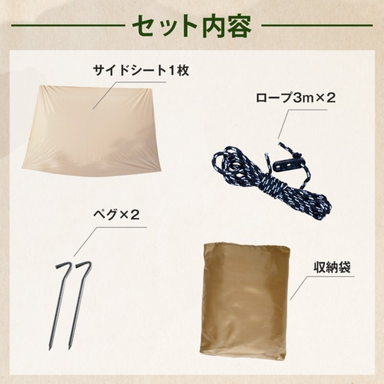 【商品内容】:サイドシート×1・ペグ×2・ロープ3m×2・収納袋