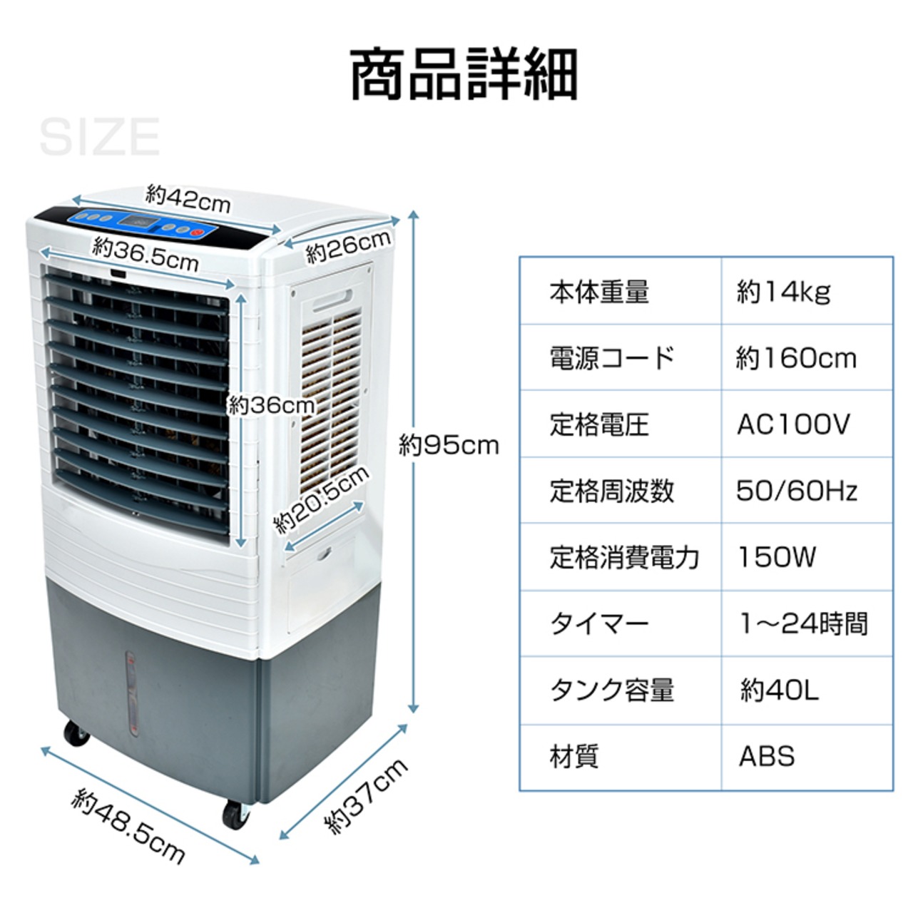 大型40L冷風機冷風扇 扇風機 静音 除菌 脱臭 3段階調整 熱中症対策 暑さ対策 首振り リモコン付
