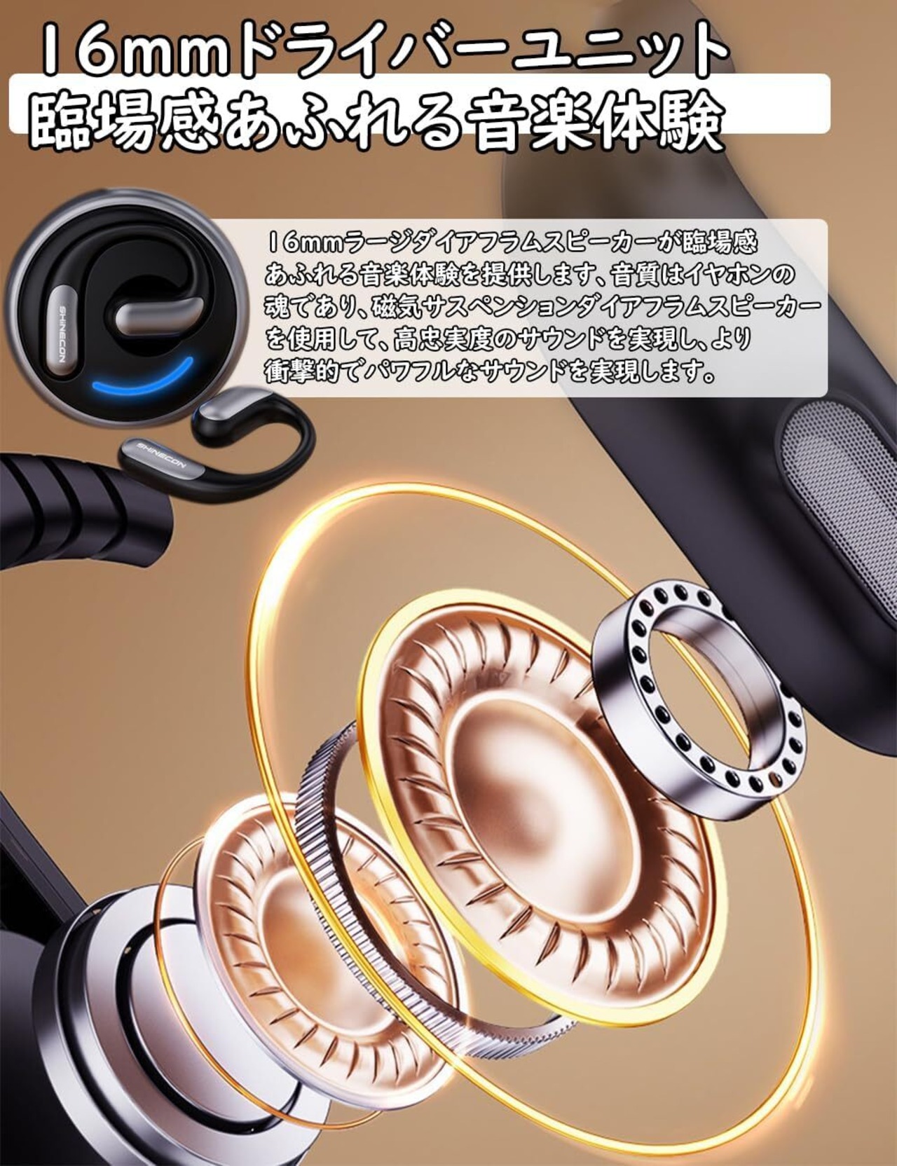 Bluetooth 5.4イヤホン 1. **最新Bluetooth 5.4**: - 高速・安定接続。 - 12m範囲、幅広いデバイスと互換性。 2. **耳に入れないデザイン**: - 開放的で快適な装着感。 - 肌に優しいシリコーン素材。 3. **高音質 & 指向性音響**: - 16mmスピーカーで臨場感ある音質。 - 音漏れを防ぎ、正確な音の伝達。 4. **ANC+ENCノイズキャンセリング**: - 25dBのノイズリダクション。 - クリアな通話品質。 5. **低遅延 & 長時間使用**: - 40ms低遅延で音画同期。 - 最大36時間使用可能、20日間待機。 快適な装着感と高音質を楽しみながら、長時間使用可能なイヤホンです。