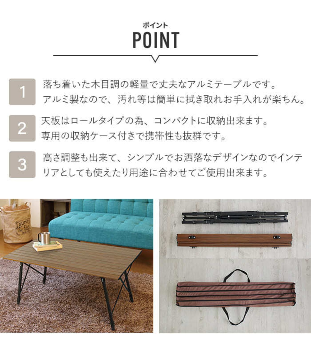 ■特徴・アルミと木目調デザインで、インドア・アウトドア両用可能。・ロールタイプで収納・携帯性抜群。・アルミ製で手入れ簡単。・高さ調節可能で用途に合わせて使えます。■シリーズ