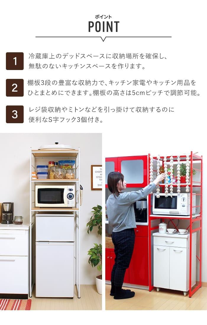 一人暮らし用の冷蔵庫が収まるサイズ感で、デッドスペースになりがちな冷蔵庫上に収納をプラスし、狭い収納場所を有効活用できます。