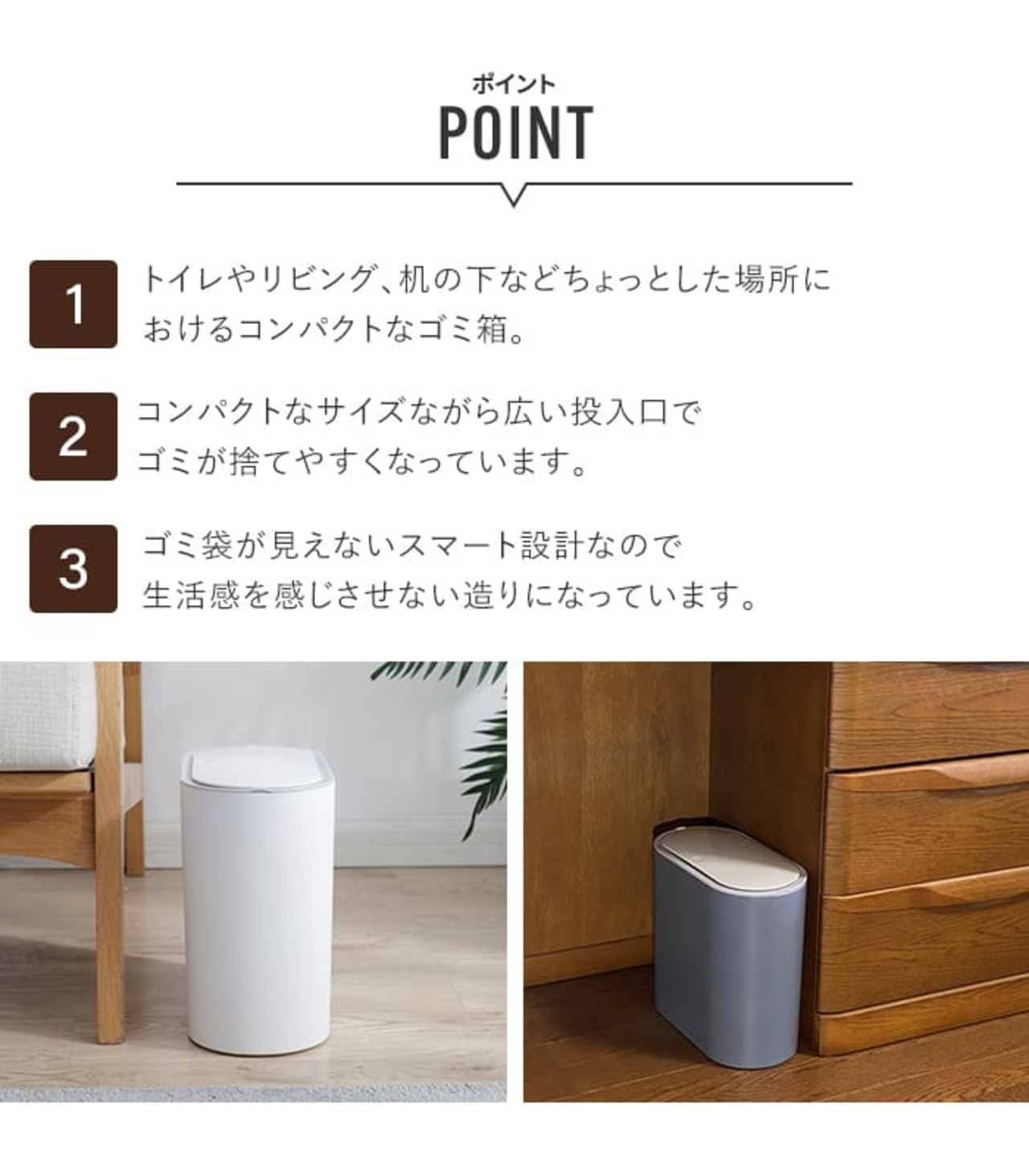 フタはワンタッチで開閉でき、インテリアに馴染むデザインでどこにでも気軽におけるゴミ箱。