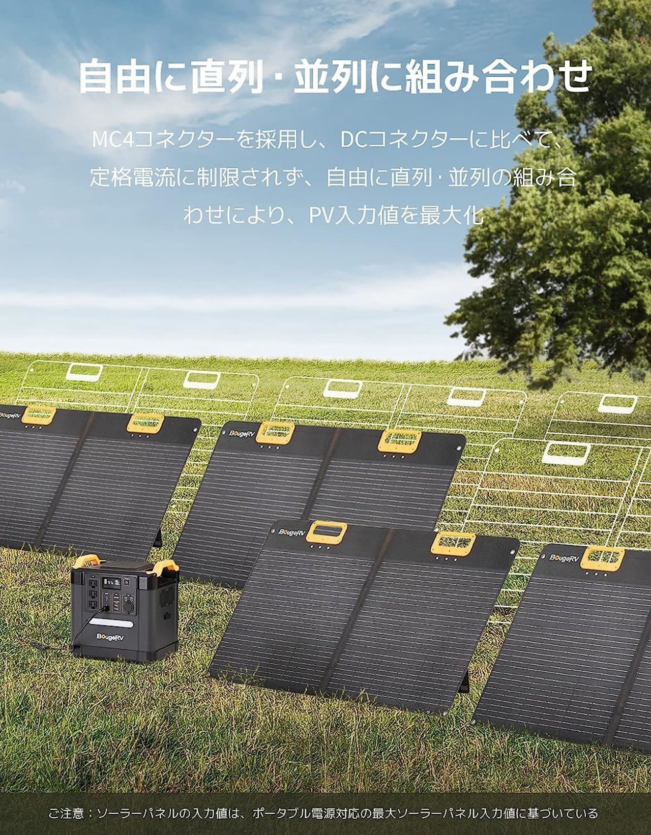 BougeRV 100W 小型ソーラーパネルチャージャーはMC4出力ポートを採用して、通常のDCポートより2倍以上の電力を出力できる、ソーラーパネルを数枚で並列可能、大容量のポータブル電源にも適用!また、陰影が出力に与える影響を低減するため、9BB電池セル(23%高交換効率)を採用し、通常の5BBセルの太陽光パネル(15%)の発電効果より倍以上向上し、耐高温性にも強くなり、暑い夏でも焼損の心配がない。