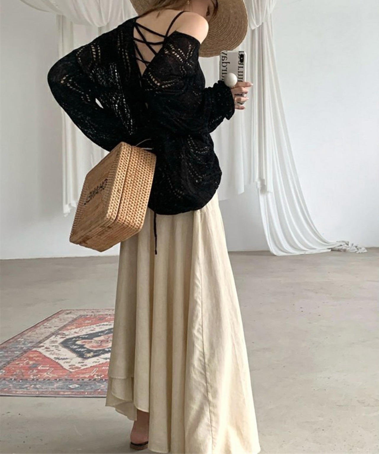 レースアップを前にすればゆるさのある抜け感スタイルに、後ろにすればセクシーな印象に