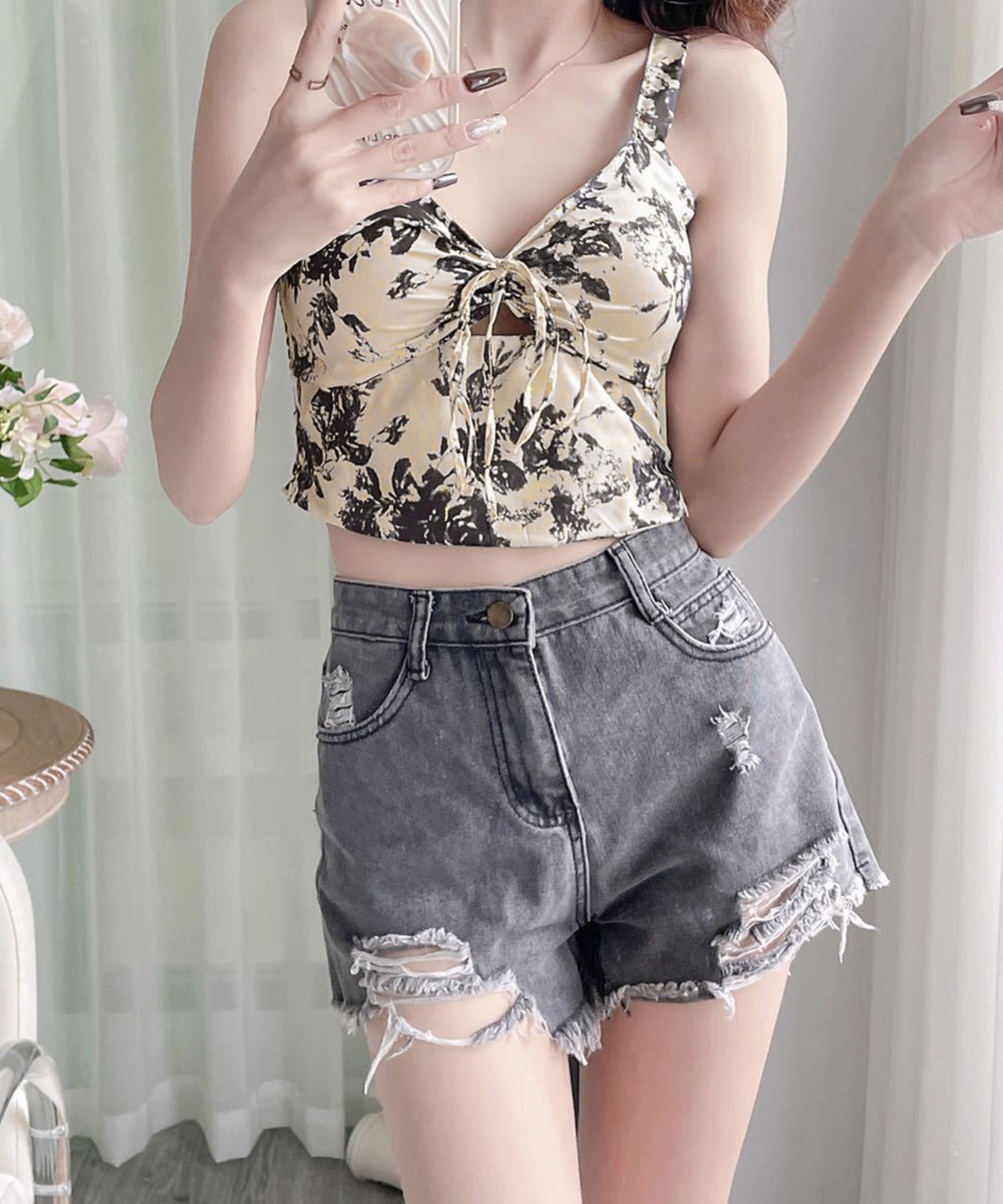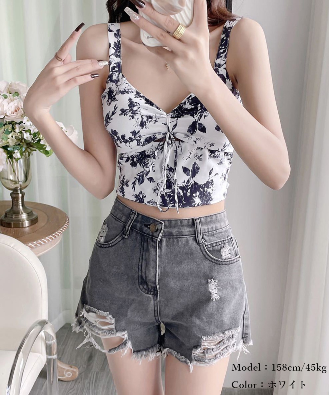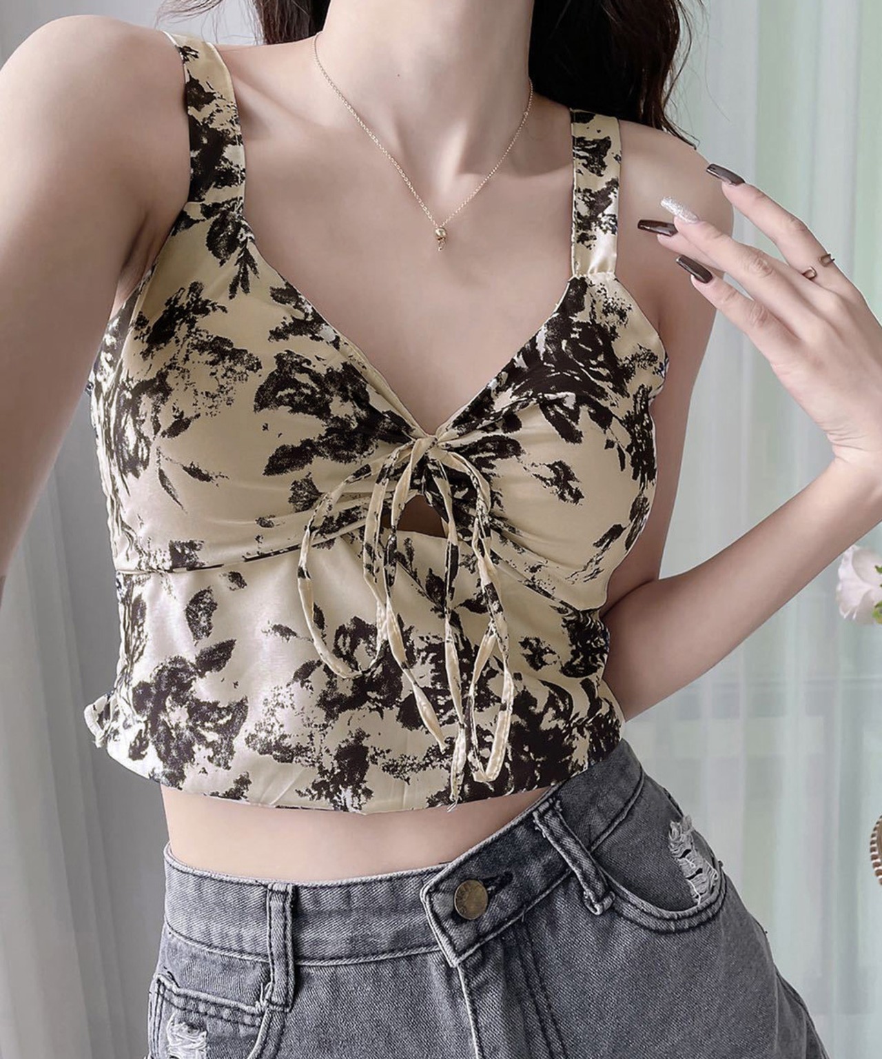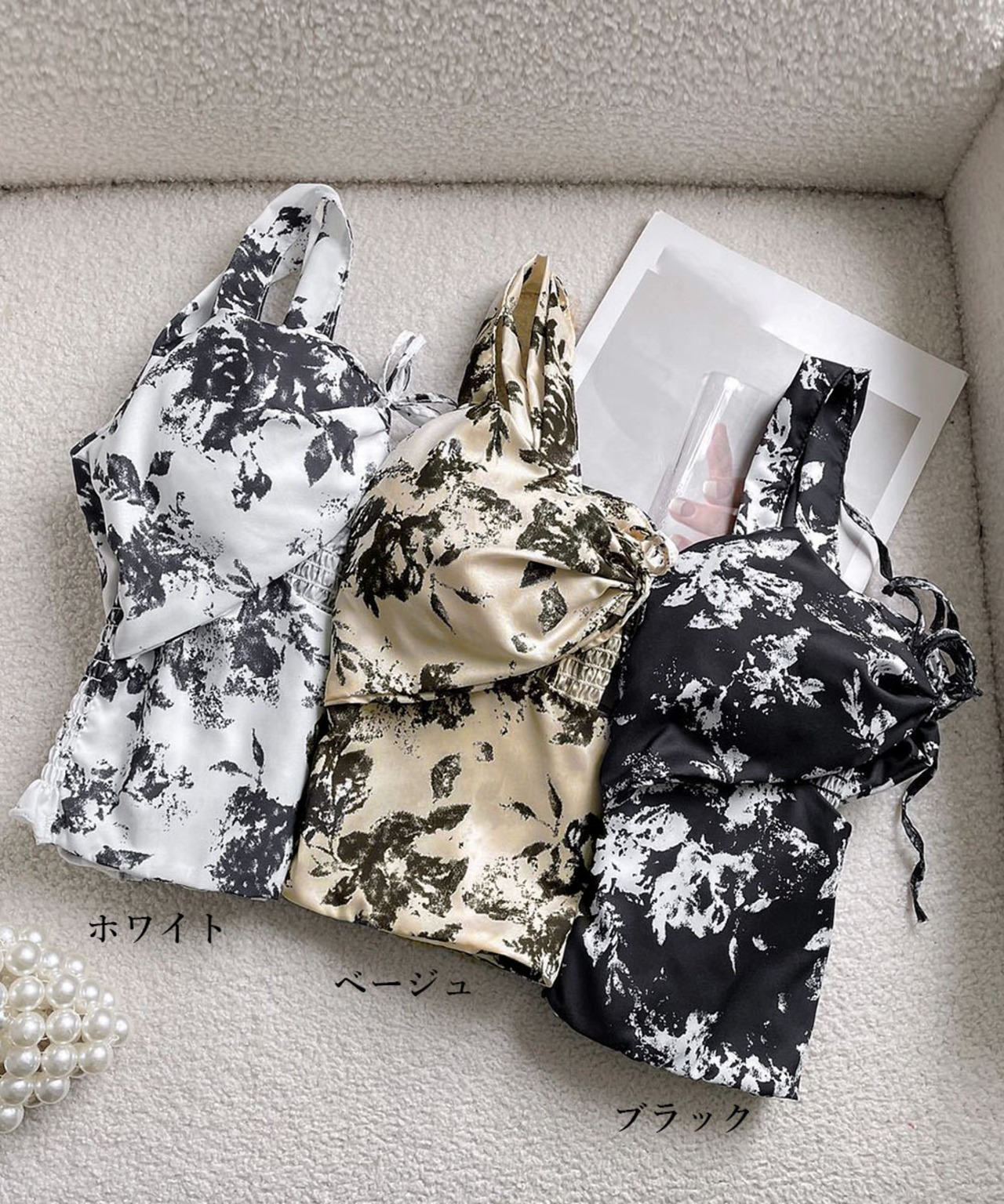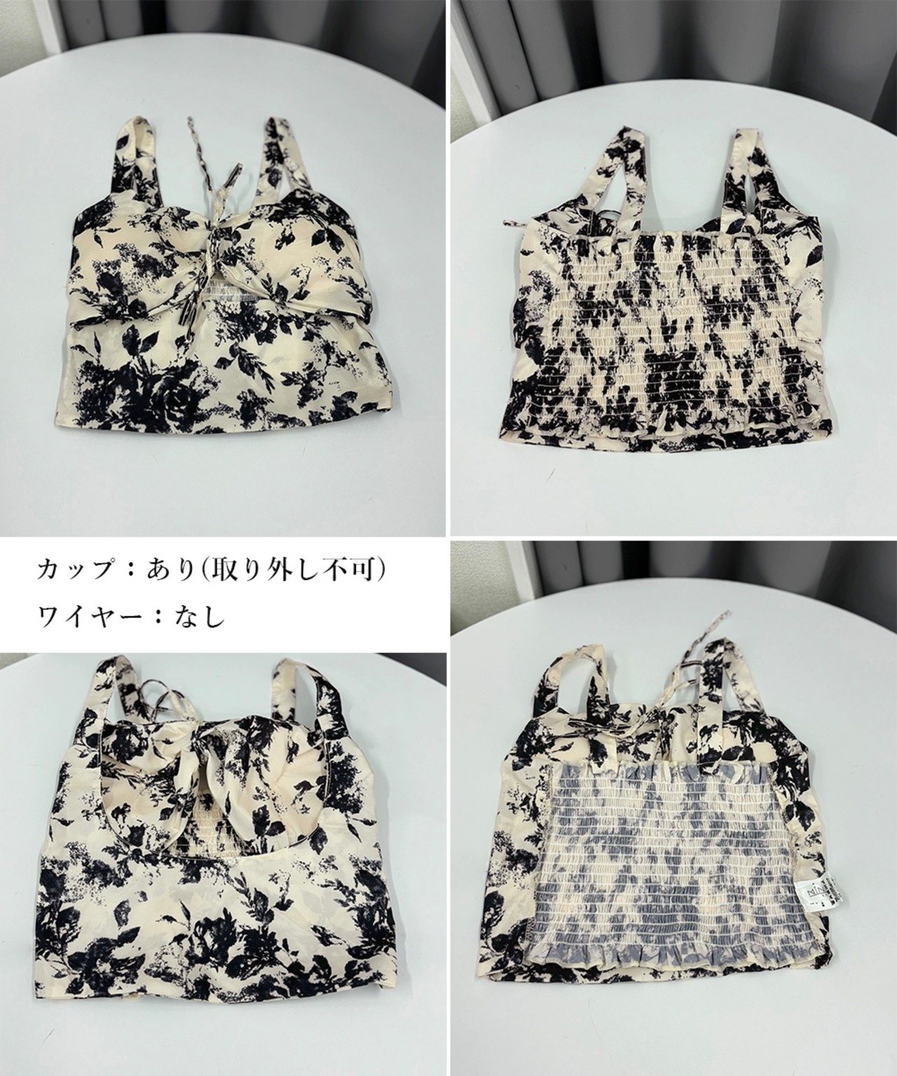 レディース バックシャーリング セクシーキャミ リゾート風 ノンワイヤー キャミブラ ショート丈 インク花柄ブラトップ