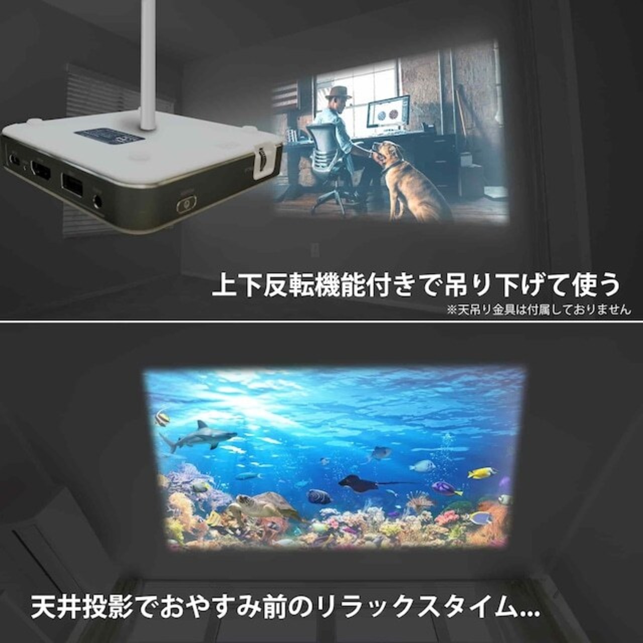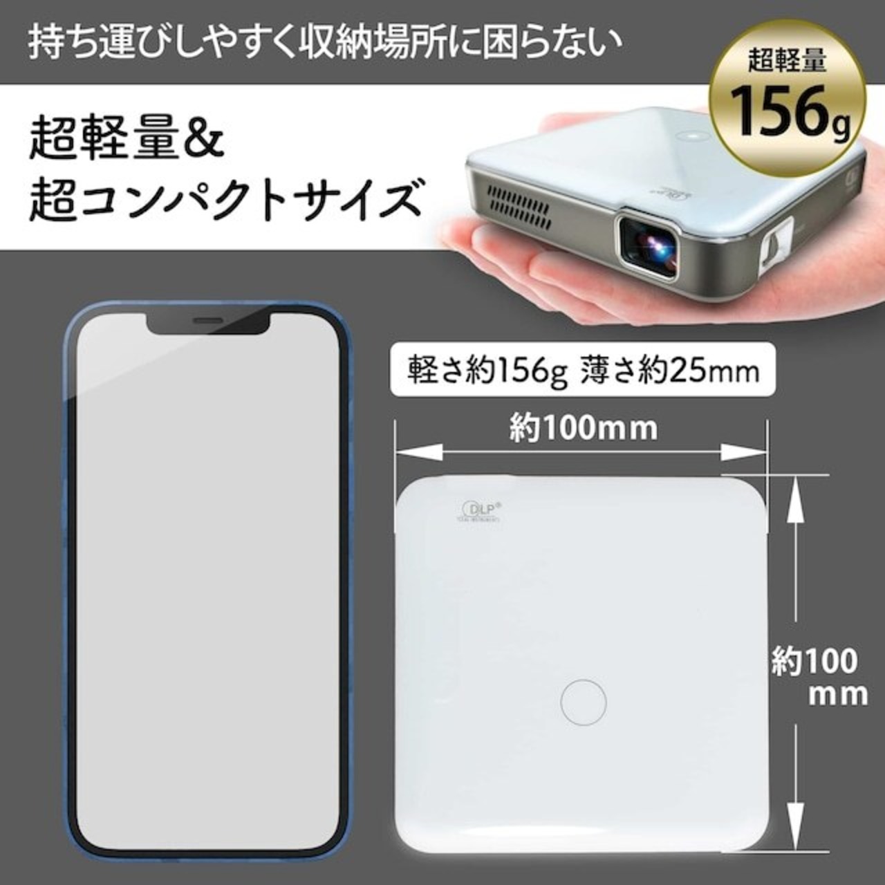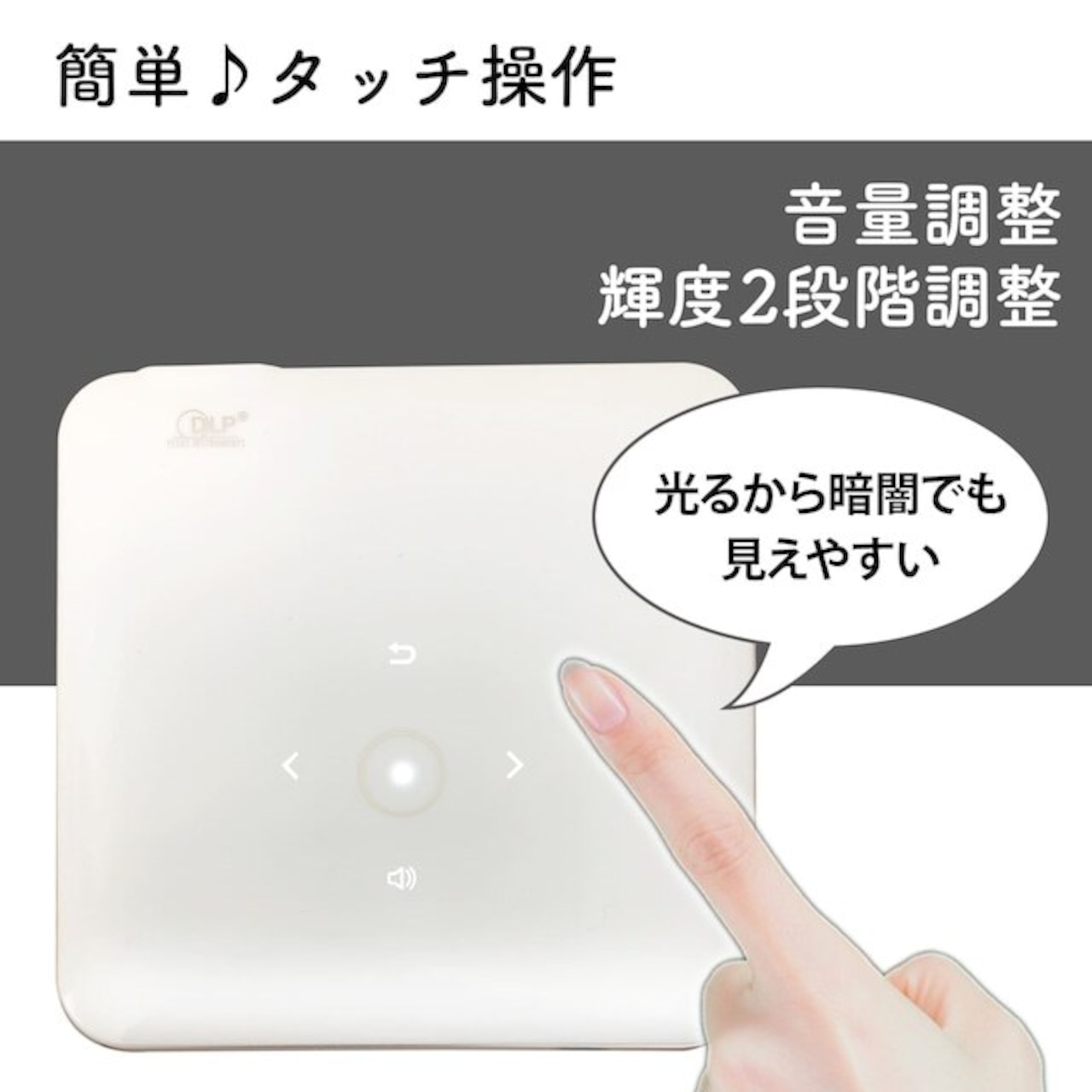コントラストコントラスト美に優れたDLP方式を採用 本プロジェクターは映像を色彩豊かに美しく演出できるDLP方式という投影方法を採用しています。 また、本製品のDLPランプの寿命は約30,000時間と非常に長く、電源オンですぐに使えてランプの耐久性も高いのが特徴です。 メンテナンスフリー仕様となっており、長くお使いいただけます。 ●Wi-Fi接続で手軽にミラーリング スマートフォンやタブレットとWi-Fi接続することでスマートフォンの画面を手軽にミラーリングできます。 YouTubeなどお気に入りの動画を大画面でお楽しみいただけます。 ※AndroidデバイスはMiracast対応の機器のみ対応しています。 ※一部有料動画配信アプリは著作権保護により、正常に出力できない場合があります。 ●超軽量&コンパクトサイズを実現 バッテリーレスのため、重さは缶コーヒーよりも軽く約156g! コンパクトな手のひらサイズとなっており、ビジネスシーンでの持ち運びにも便利です。 また高級感のあるシンプルなデザインでどんなインテリアにも馴染みやすく、出しっぱなしにしても邪魔になりません。 ●直観的でわかりやすいタッチ操作 本体には光るイルミネーションボタンを採用しており、暗い部屋でも見やすく操作ができます。 音量調整や輝度調整が可能です。 ●多機器に対応した豊富な互換性 スマートフォンはもちろん、SwitchやPS5など、様々な機種に対応しております。 本製品を使えば大画面で迫力あるゲームを楽しむことも可能です。 また、USBメモリーやmicroSDカードを本体に差し込めば、写真や動画データを観ることができ、ビジネスシーンでも活躍します。 ●上下反転機能搭載 上下反転機能がついていますので、天井に直付けで吊り下げてお使いいただくことも可能です。 さらに、ベッド頭上に取り付ければ、天井へも投影可能になります。 ※それぞれに必要な天吊り金具や可変三脚などは付属しておりません。 ●付属品も充実で購入後すぐに使用可能 高さ18cmまで昇降可能な三脚アルミスタンド、約2mの電源延長コードが標準で付属しており、ご購入後すぐにお使いいただけます。 【付属品】 ACアダプター付Type-C電源ケーブル(1.2m)、HDMIケーブル(0.8m)、Type-C電源延長ケーブル(2m)、三脚アルミスタンド、保証書付取扱説明書
