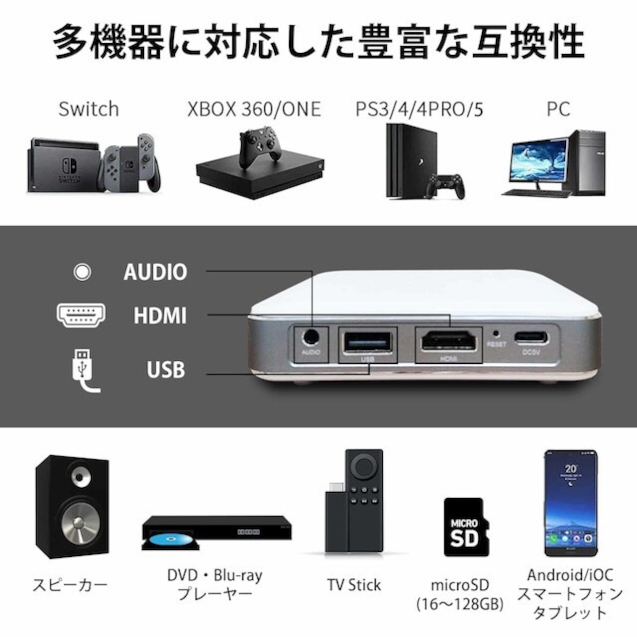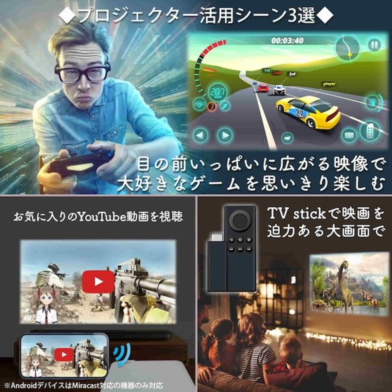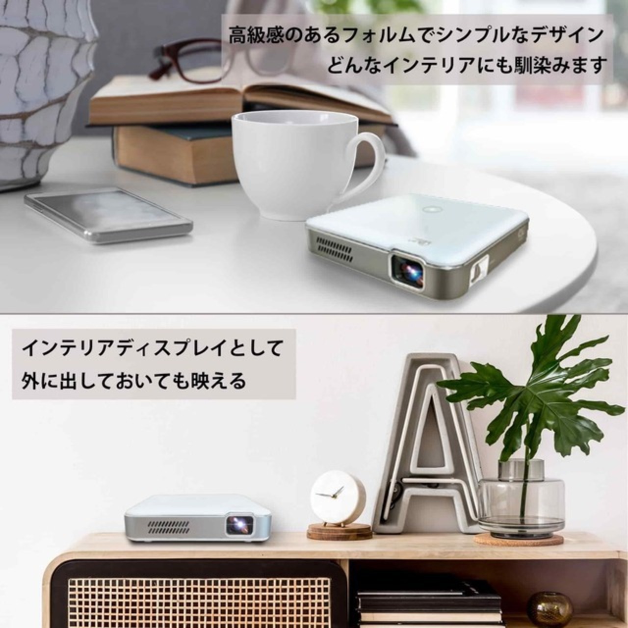 コントラストコントラスト美に優れたDLP方式を採用 本プロジェクターは映像を色彩豊かに美しく演出できるDLP方式という投影方法を採用しています。 また、本製品のDLPランプの寿命は約30,000時間と非常に長く、電源オンですぐに使えてランプの耐久性も高いのが特徴です。 メンテナンスフリー仕様となっており、長くお使いいただけます。 ●Wi-Fi接続で手軽にミラーリング スマートフォンやタブレットとWi-Fi接続することでスマートフォンの画面を手軽にミラーリングできます。 YouTubeなどお気に入りの動画を大画面でお楽しみいただけます。 ※AndroidデバイスはMiracast対応の機器のみ対応しています。 ※一部有料動画配信アプリは著作権保護により、正常に出力できない場合があります。 ●超軽量&コンパクトサイズを実現 バッテリーレスのため、重さは缶コーヒーよりも軽く約156g! コンパクトな手のひらサイズとなっており、ビジネスシーンでの持ち運びにも便利です。 また高級感のあるシンプルなデザインでどんなインテリアにも馴染みやすく、出しっぱなしにしても邪魔になりません。 ●直観的でわかりやすいタッチ操作 本体には光るイルミネーションボタンを採用しており、暗い部屋でも見やすく操作ができます。 音量調整や輝度調整が可能です。 ●多機器に対応した豊富な互換性 スマートフォンはもちろん、SwitchやPS5など、様々な機種に対応しております。 本製品を使えば大画面で迫力あるゲームを楽しむことも可能です。 また、USBメモリーやmicroSDカードを本体に差し込めば、写真や動画データを観ることができ、ビジネスシーンでも活躍します。 ●上下反転機能搭載 上下反転機能がついていますので、天井に直付けで吊り下げてお使いいただくことも可能です。 さらに、ベッド頭上に取り付ければ、天井へも投影可能になります。 ※それぞれに必要な天吊り金具や可変三脚などは付属しておりません。 ●付属品も充実で購入後すぐに使用可能 高さ18cmまで昇降可能な三脚アルミスタンド、約2mの電源延長コードが標準で付属しており、ご購入後すぐにお使いいただけます。 【付属品】 ACアダプター付Type-C電源ケーブル(1.2m)、HDMIケーブル(0.8m)、Type-C電源延長ケーブル(2m)、三脚アルミスタンド、保証書付取扱説明書
