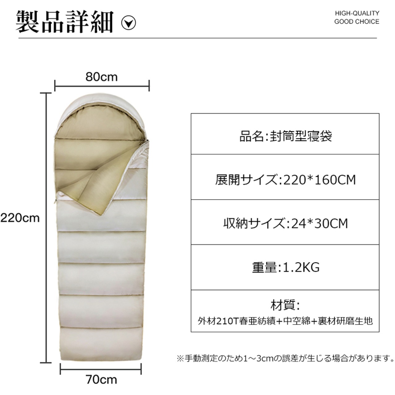 外材210T春亜紡績+中空綿+裏材研磨生地