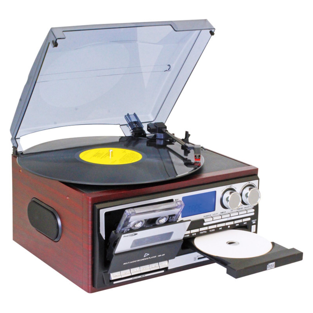 レコードプレーヤー、CDラジカセ、デジタルプレーヤーが1台の多機能レコードプレーヤー。レコードプレーヤー:EP/LP/SP盤再生に対応(回転数33/45/78)。カセットテープ:録音、再生、一時停止、巻き戻し、早送りボタン操作。CDプレーヤー:再生(通常・プログラム・リピート・ランダム)。SD/USBメディアプレーヤー:MP3録音、再生。SD/SDHC:128MB~32GB※2GB推奨、USB2.0,3.0:128MB~16GB※2GB推奨。ラジオ:AM/FM/ワイドFM受信。ステレオスピーカー内蔵。コードの長さ約1.5m。消費電力16W。