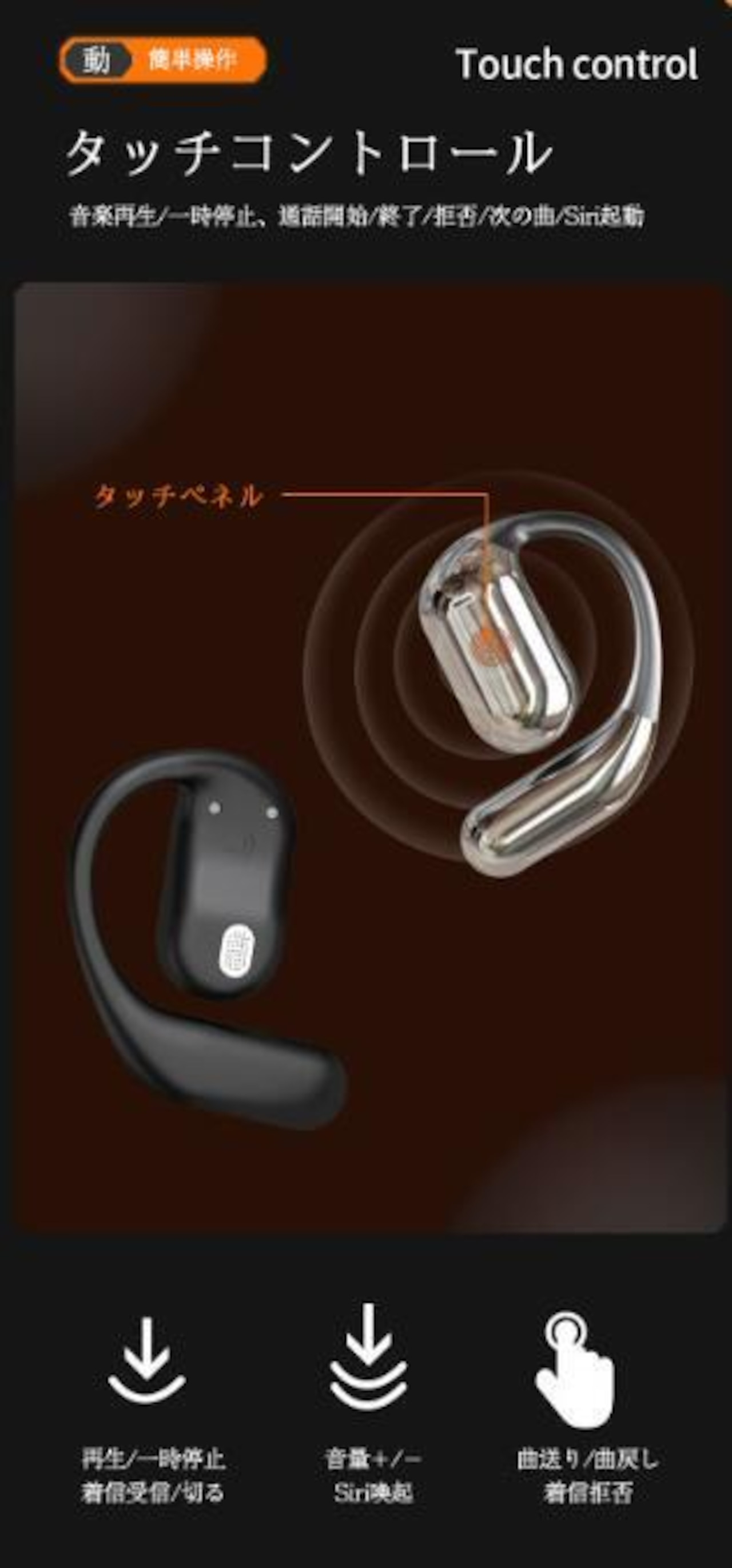【タッチコントロール】 タッチコントロール式Bluetoothイヤホン、高感度なパネルと高品質な部品を採用し、タッチパネルをタッチするだけで、音楽再生/一時停止、通話開始/終了/拒否/次の曲/Siri起動などの操作をすべて実現可能。
