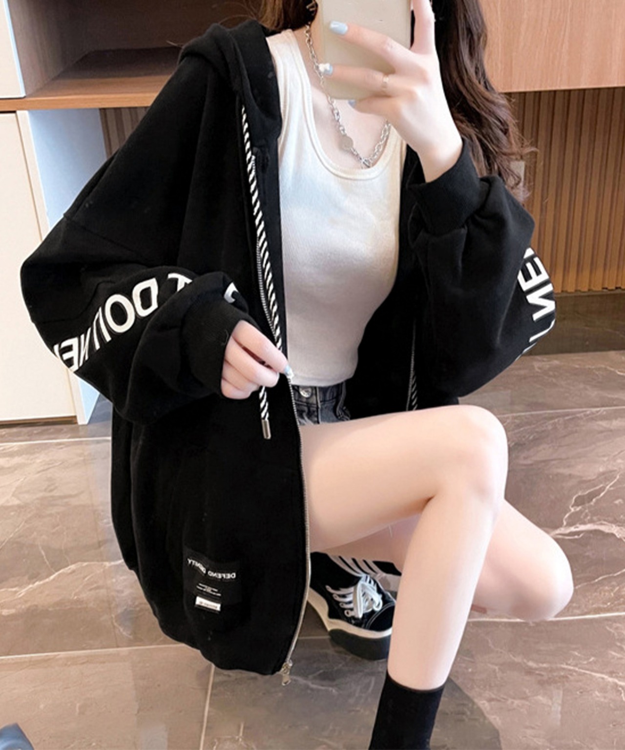 トップスとしても、ジップを開けて羽織りとしても使えるので、スタイリングの幅が広がる