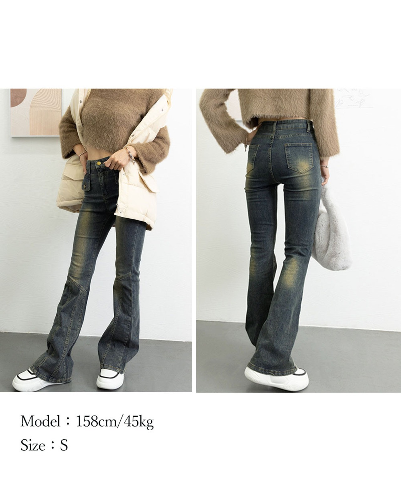 ジーパン ヴィンテージパンツ 美脚 脚長シーズン ブーツカットデニム カジュアル 着やせ ロングパンツ ストレッチパンツ