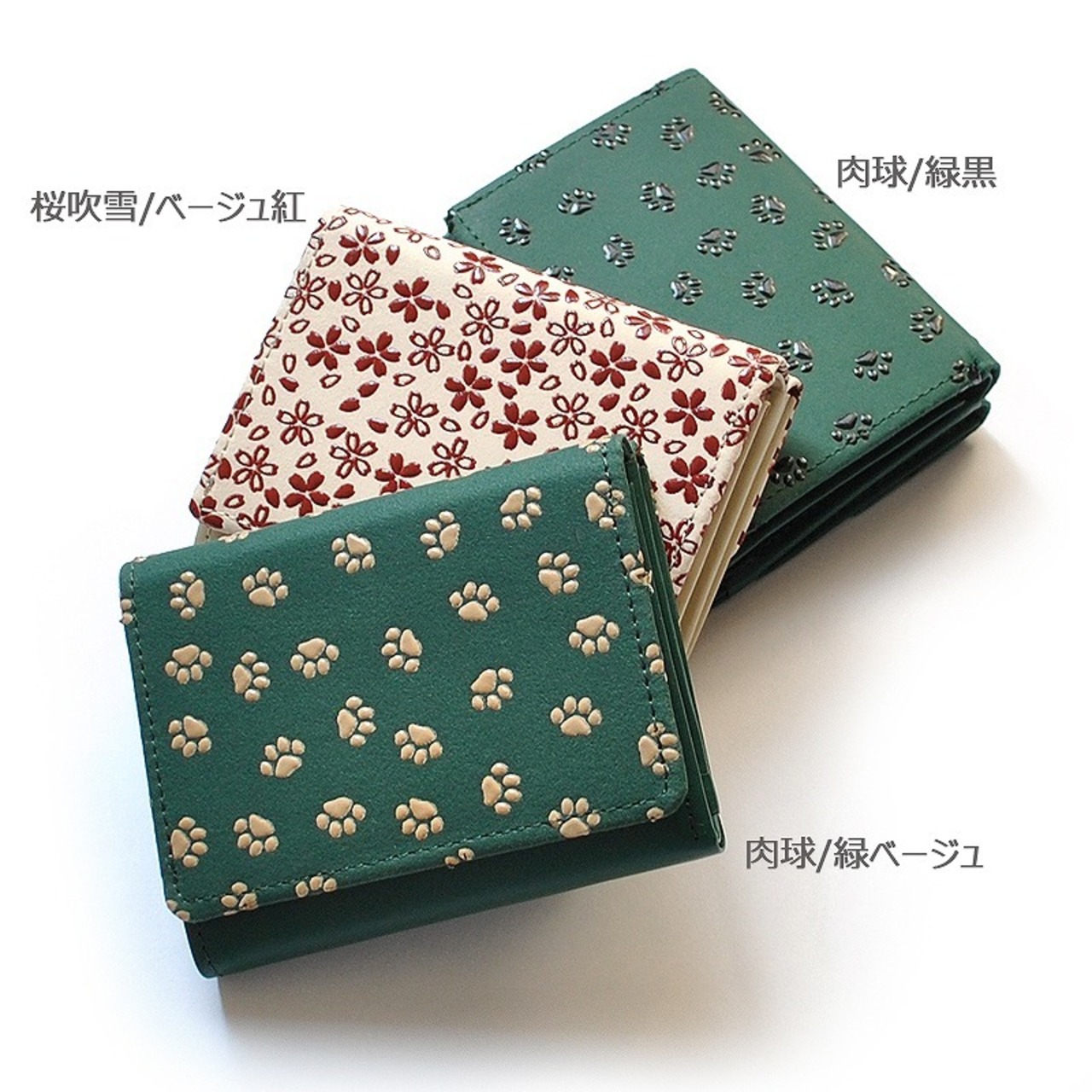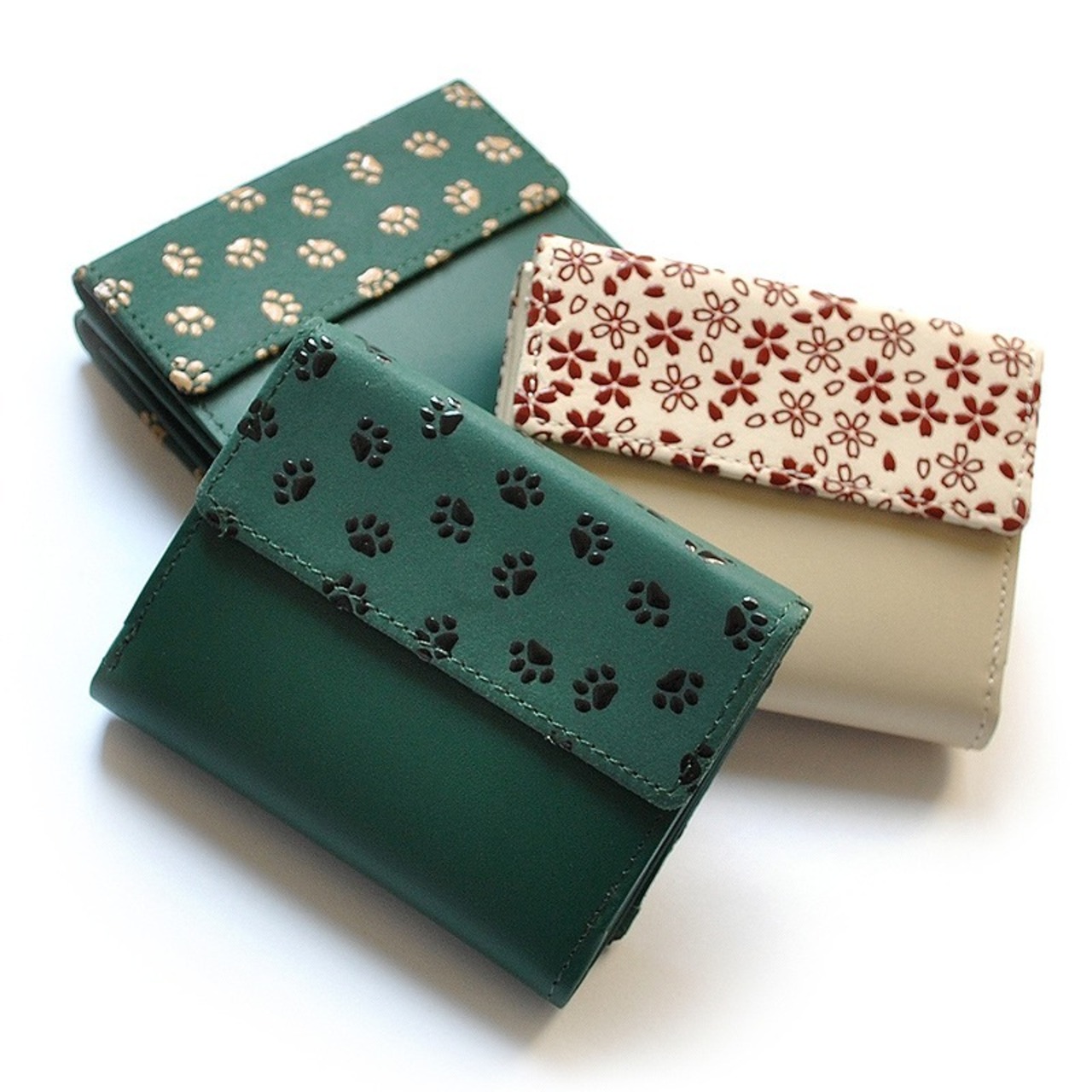 鹿革 漆付け 牛革 桜吹雪柄 肉球柄 印伝 三つ折りモデル コンパクトウォレット