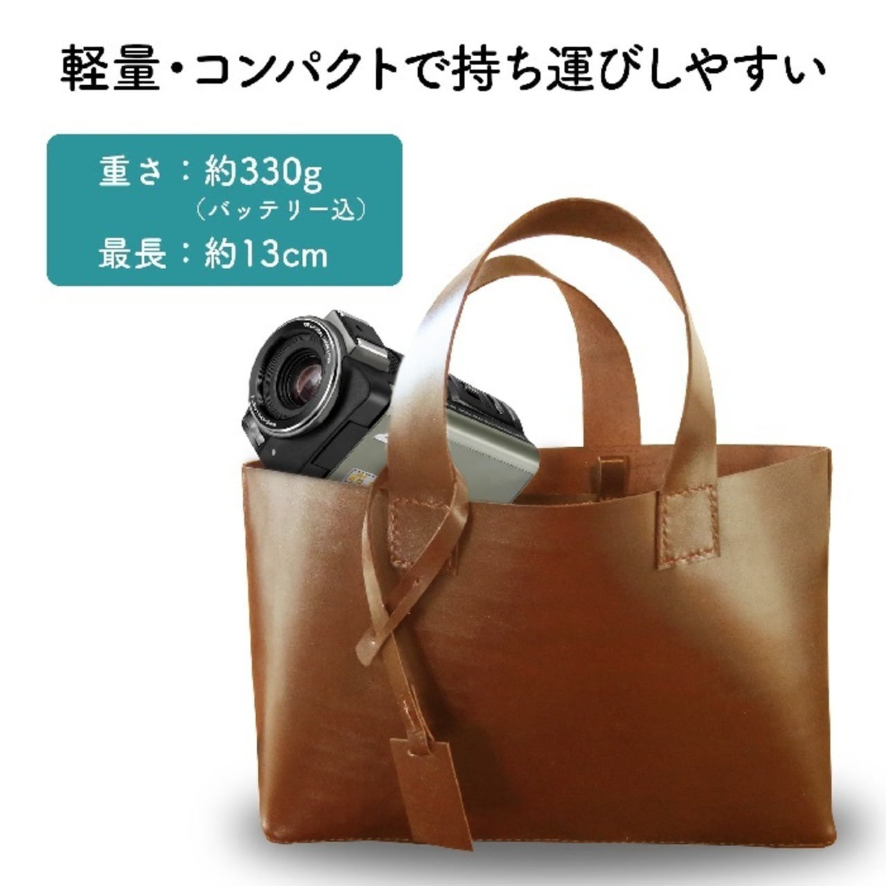 持ち歩きやすい、手のひらサイズの約303グラムの軽さでコンパクトな4Kビデオカメラです。