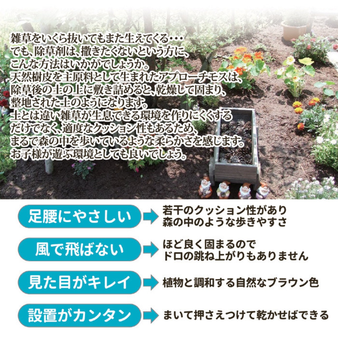 雑草をいくら抜いてもまた生えてくる・・・でも、除草剤は、撒きたくない、という方に、こんな方法はいかがでしょうか。天然樹皮を主原料として生まれたアプローチモスは、除草後の土の上に敷き詰めると、乾燥して固まり、整地された土のようになります。土とは違い、雑草が生息できる環境を作りにくくするだけでなく、適度なクッション性もあるため、まるで森の中を歩いているような柔らかさを感じます。お子様が遊ぶ環境としても良いでしょう。コンクリート成分などは一切含まれていないため、処分方法も、砕いて土と混ぜるか、一般ゴミとしても処理が可能です。