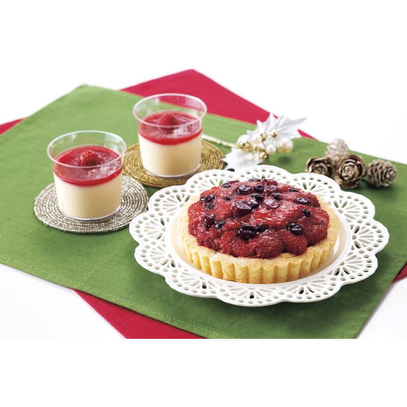 クリスマスカラーの赤を基調としたミックスベリータルトはストロベリー・クランベリー・ブルーベリーを使用し、ホールタイプのタルトにしました。木苺プリンはとろける食感のプリンに木苺とソースをあしらいました。
