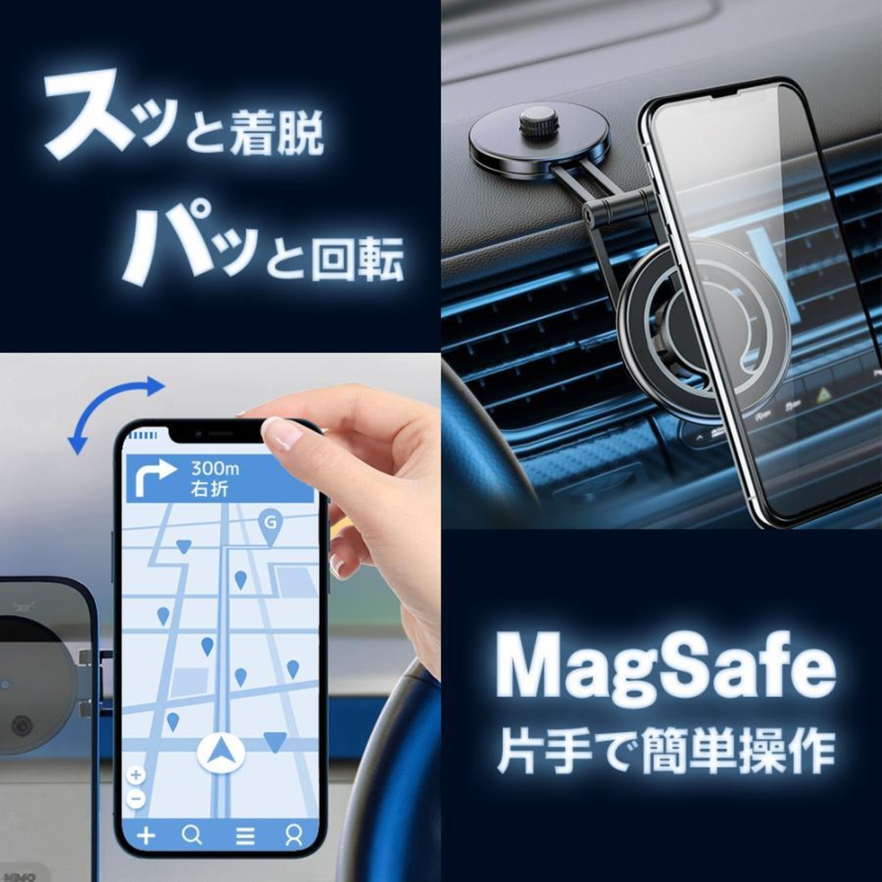 当商品には、MagSafeが搭載されていて、片手で簡単に着脱や画面の回転が可能で、運転を邪魔しません。