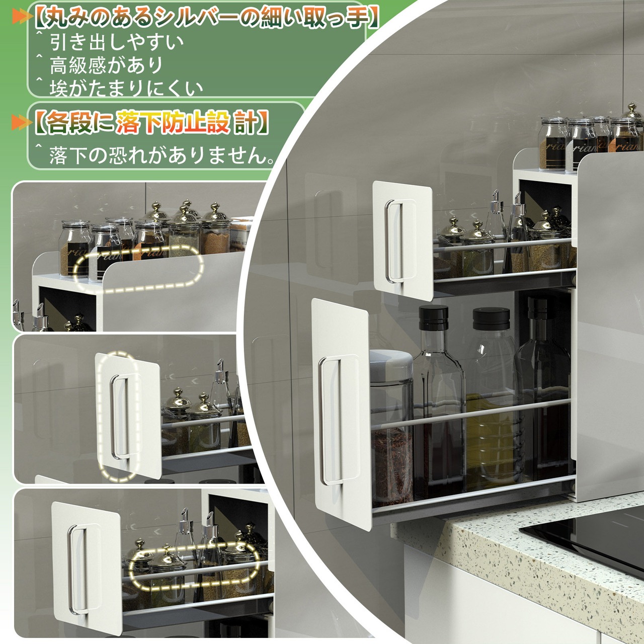 隠せる調味料ラック 2段 幅14.4cm 奥行35cm 高さ48cm 台所用 大容量 引き出し式 コンロ横 キッチンラック 雪白色, ブラック