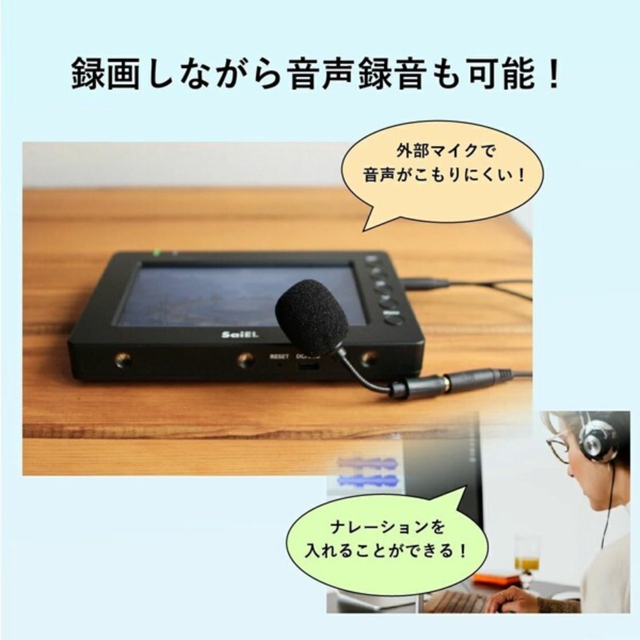 付属のマイクと分配ケーブルを使用して録画時に自分の声でナレーションをれることも可能。