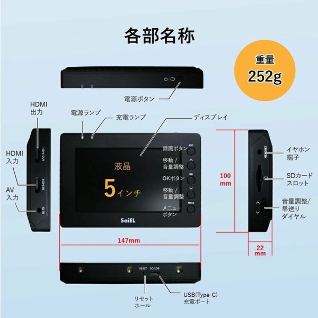 録画ボタン/移動・音量調節/OKボタン/移動・音量調節/メニューボタン/HDMI出力/HDMI入力/AV入力/電源ランプ/充電ランプ/ディスプレイ/電源ボタン/リセットホール/USB(Type-C)充電ポート/イヤホン端子/SDカードスロット/音量調整・早送りダイヤル