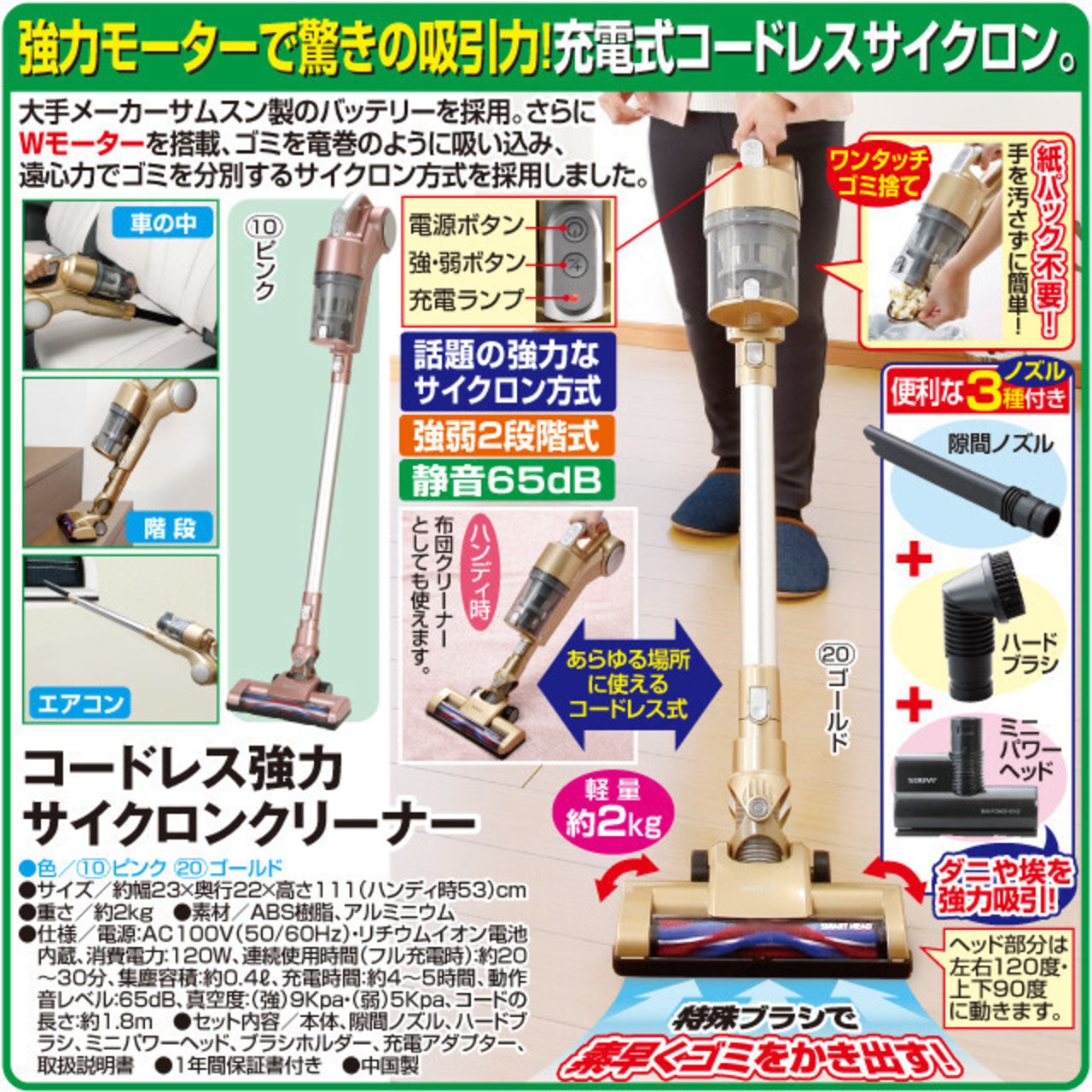 ●大手メーカーサムスン製のバッテリーを採用。さらにWモーターを搭載、ゴミを竜巻のように吸い込み、遠心力でゴミを分別するサイクロン方式を採用しました。