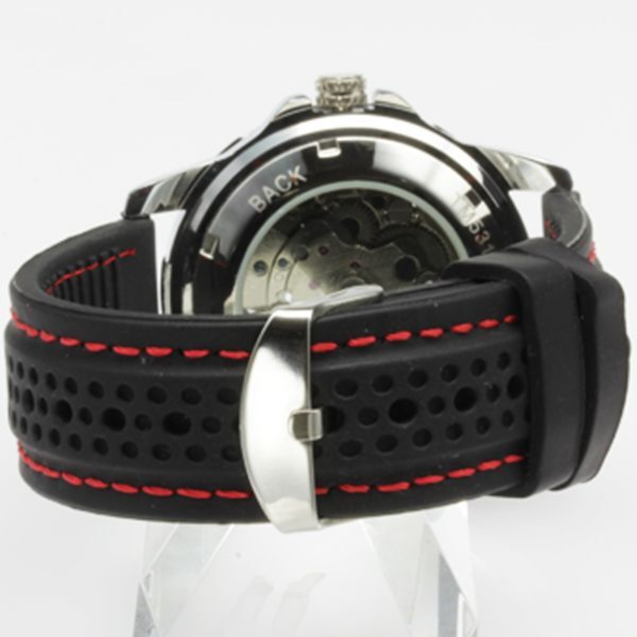 文字盤から、歯車やテンプなどが見え、機械の動きが視覚的にも楽しめるスケルトンの仕様にラバーベルトを合わせたカジュアルなモデル。