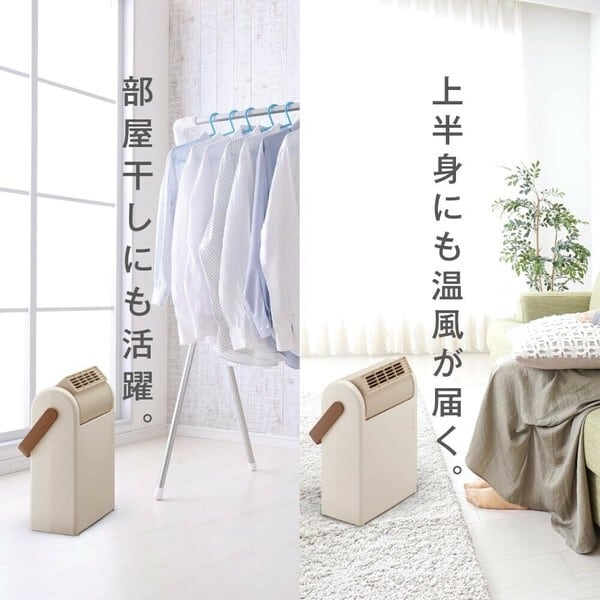 上下に動く送風口を上向きにして衣類乾燥にも使えるハンドル付きで持ち運びやすく、送風モードで夏も活躍。