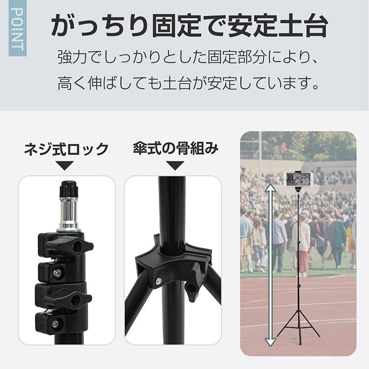 ■ネジ式ロックでしっかり固定でき、高く伸ばしても土台が安定しています。