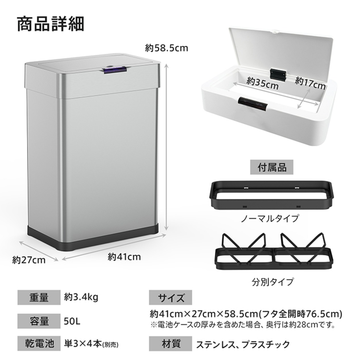 ゴミ箱 センサー付き フタ付き 自動開閉 タッチ操作 電池 50L 45L袋 大型 大容量