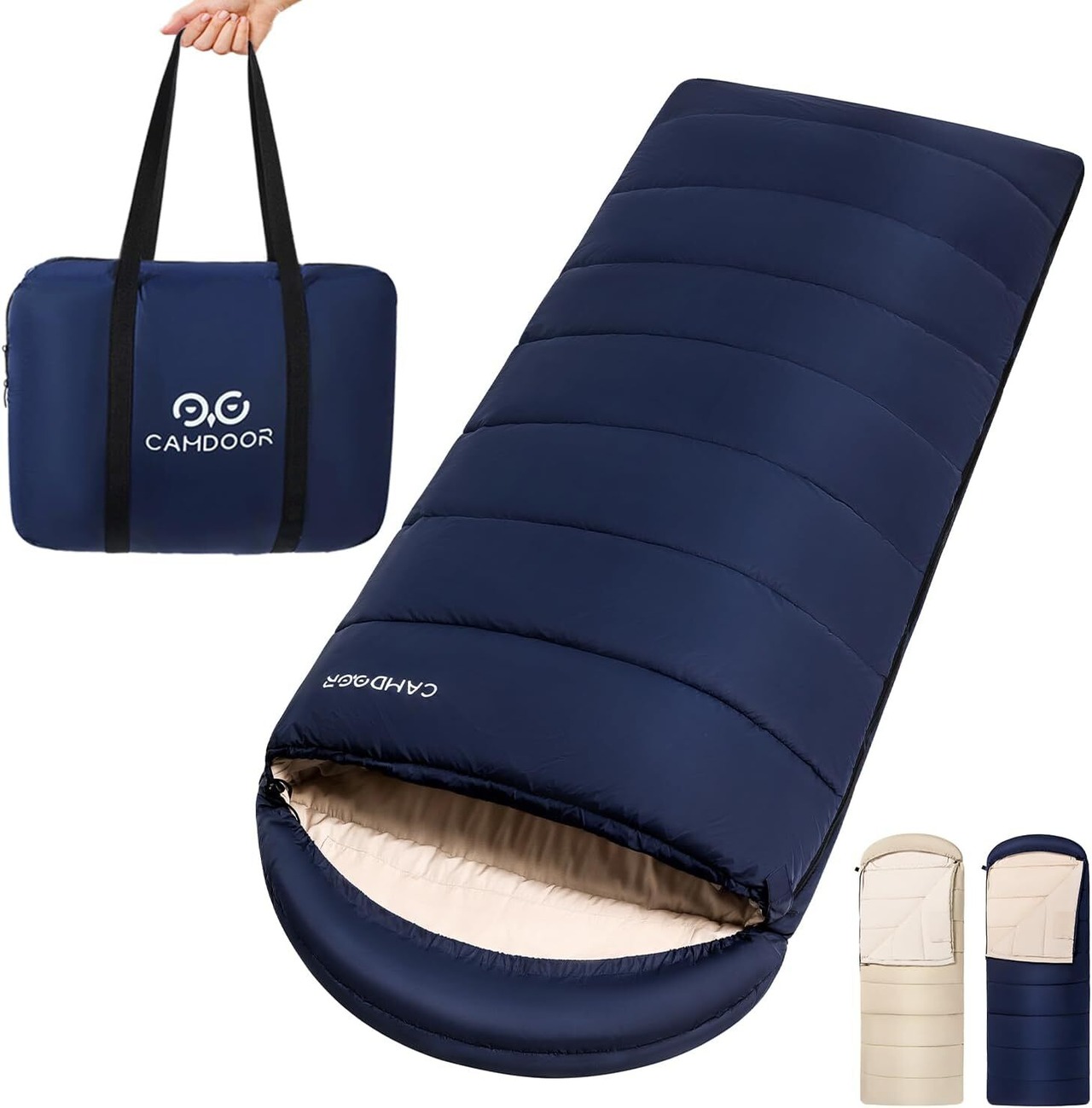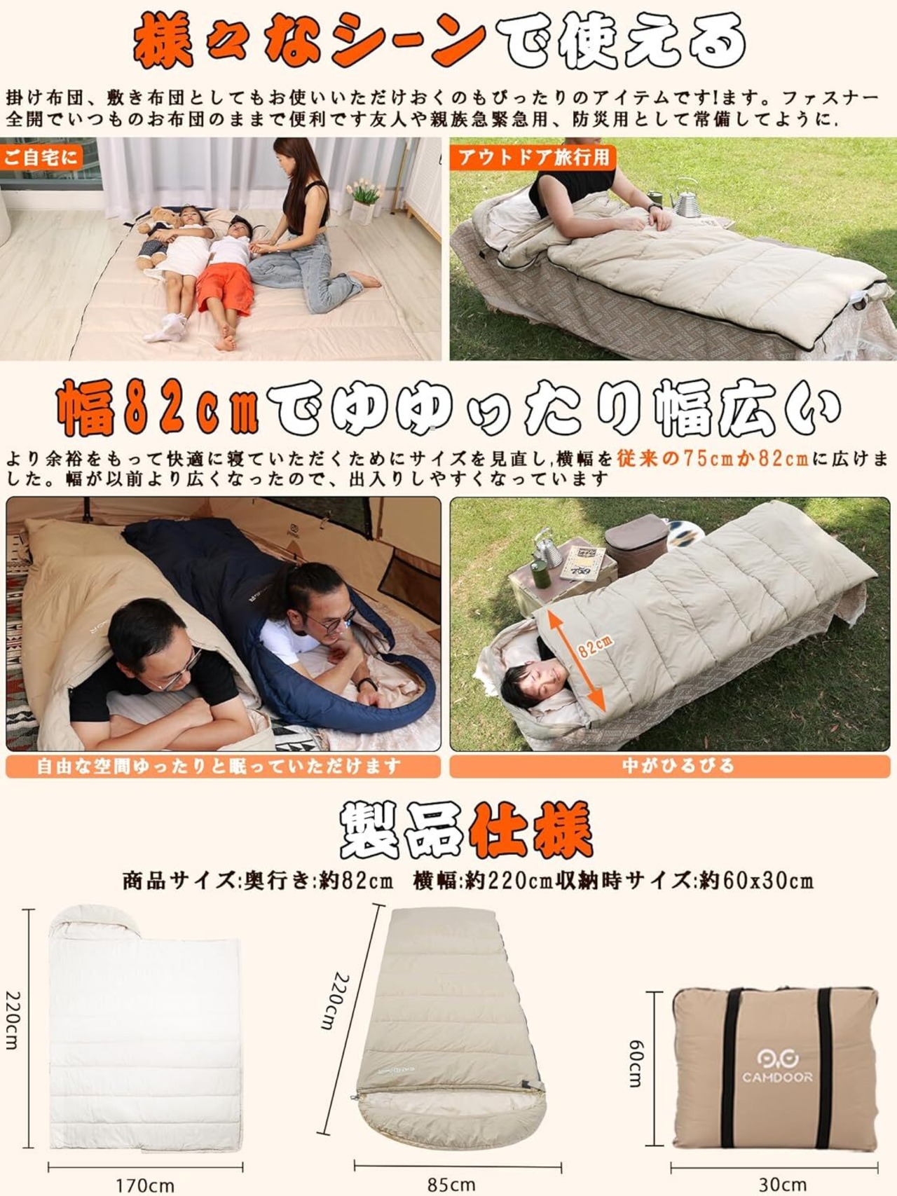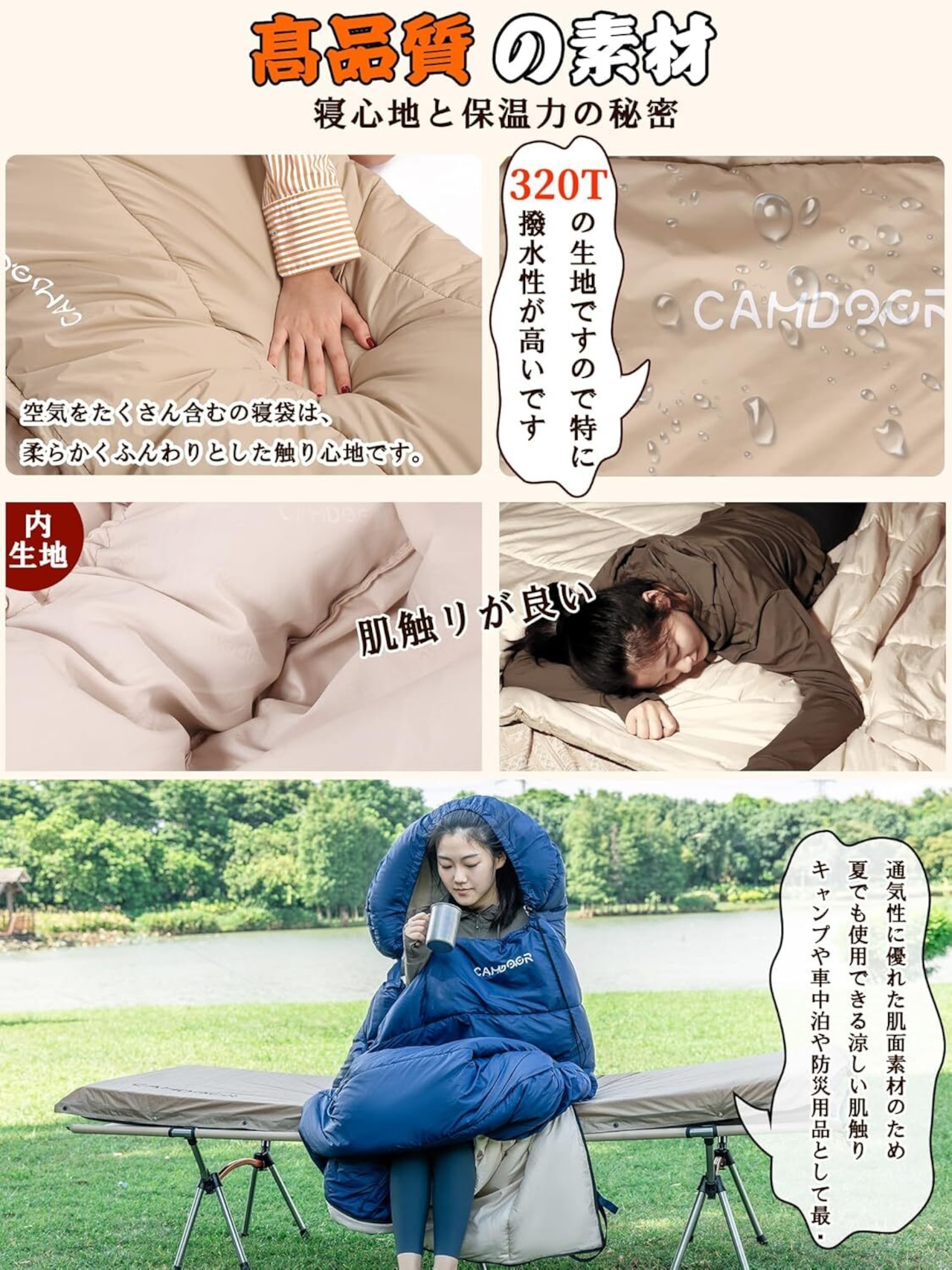 【2024年最新寝袋】✅寝袋は人工ダウンを使用しているため、市販されている同じ重量の中空タウン中材の寝袋より暖かくて柔らかい。✅30秒でキレイに収納可能。持ち運びが簡単。✅1年間の品質保証を付いており。 【人工ダウンの保温より】CAMDOORの寝袋動物性成分を100%含まず、環境に優しく再生可能です。人工ダウンは羽毛のように動物性たんぱく質を含まないため羽毛のようないやな動物臭がないのが特徴です。 人工ダウンの繊維構造は羽毛の繊維構造を人工的に再現し保温力と柔らかさ、軽さを実現しました。この素材は家で簡単に洗えて、ダウンと中空綿の長所を組み合わせました。保温性と通気性に優れています。市販されている同じ重さの中綿素材の寝袋よりも暖かくて柔らかいです。外気に邪魔されることなく、安心して眠ることができます。アウトドア、キャンプ、車中泊、登山、旅行、花見、災害などに最適です。動物性素材に敏感なご家族や、お子様もご使用いただけます。 【高品質ナイロン素材】シュラフの外側素材は防水性の高いナイロン素材を採用しており、市販の寝袋に比べて優れた防水性と耐裂性を持っています。引っ張ってまだ破られにくく、油や海水のどども強くて、カビにも強いです。うち生地はソフトポリエステル100%を採用し、保温性と通気性に優れています。雨や霧が降っても防水機能が付いているので、濡れずに安心して時間を過ごすことができます。冬場の使用に最適です。飲み物や水をこぼしても紙で軽く拭くことができ、表地はダウンジャケットに使われるマット生地で、贅沢な感じがします。ダウンは透湿性が低く、汗や雨で濡れても乾燥しにくいのに対し、テトロンはかさばり保温性に欠けます。両者の欠点を克服したからこそ、CAMDOOR寝袋の誕生です。