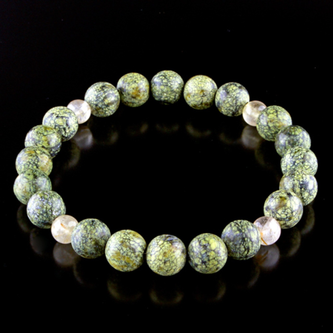 蛇紋石20個(8mm珠)、金針水晶4個(6mm珠)[サイズ]約18cm(内周)[重量]約17g[中糸]ポリウレタンゴム[付属品]専用巾着袋、ジュエリー品質保証書[個装サイズ]縦15.8×横10.0×高さ2.0(cm)/27(g)